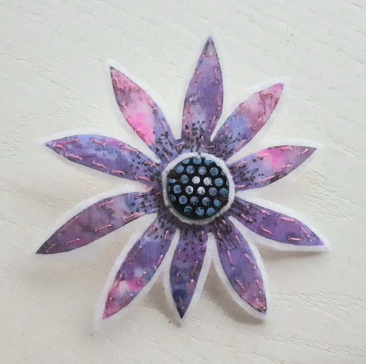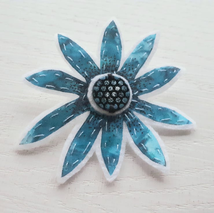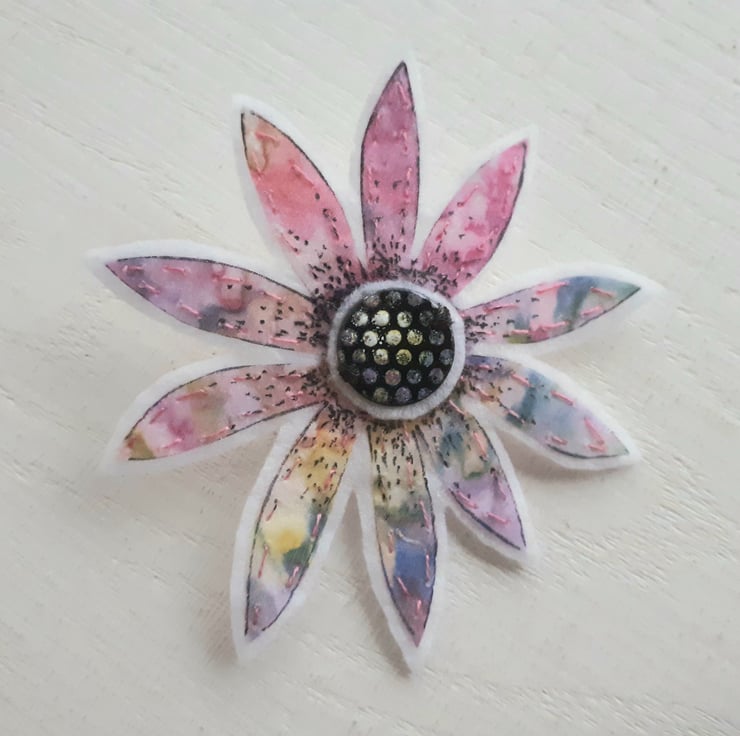 My Flower Brooch Kit features high quality and handcrafted materials, including silk hand-painted using the salt effect technique and an detailed disc I have enamelled especially for the kit. There is also 100% lambs wool felt for backing the flower and silk thread. The updated kit now has felt is in either a marled white/grey, or a plain/marled colour to tone wIth the silk.