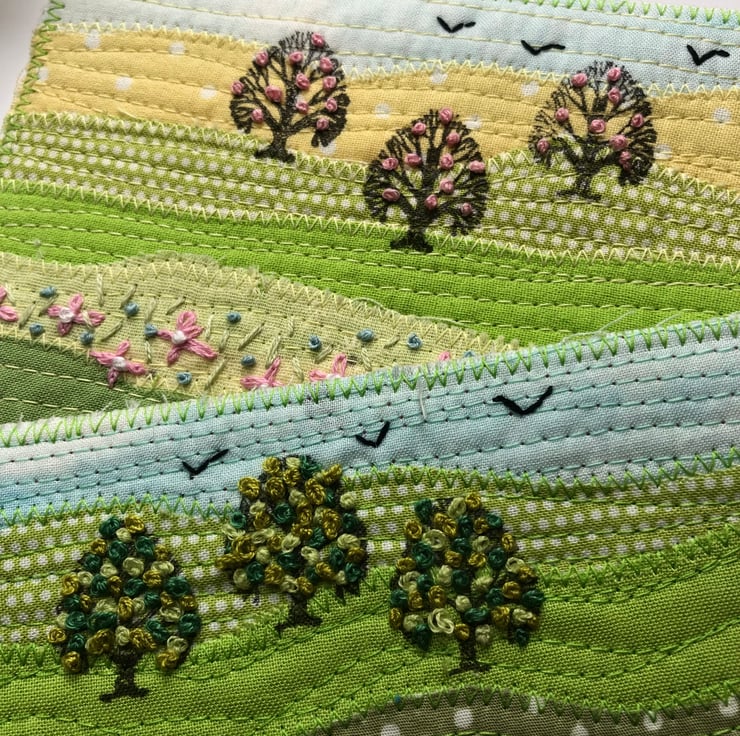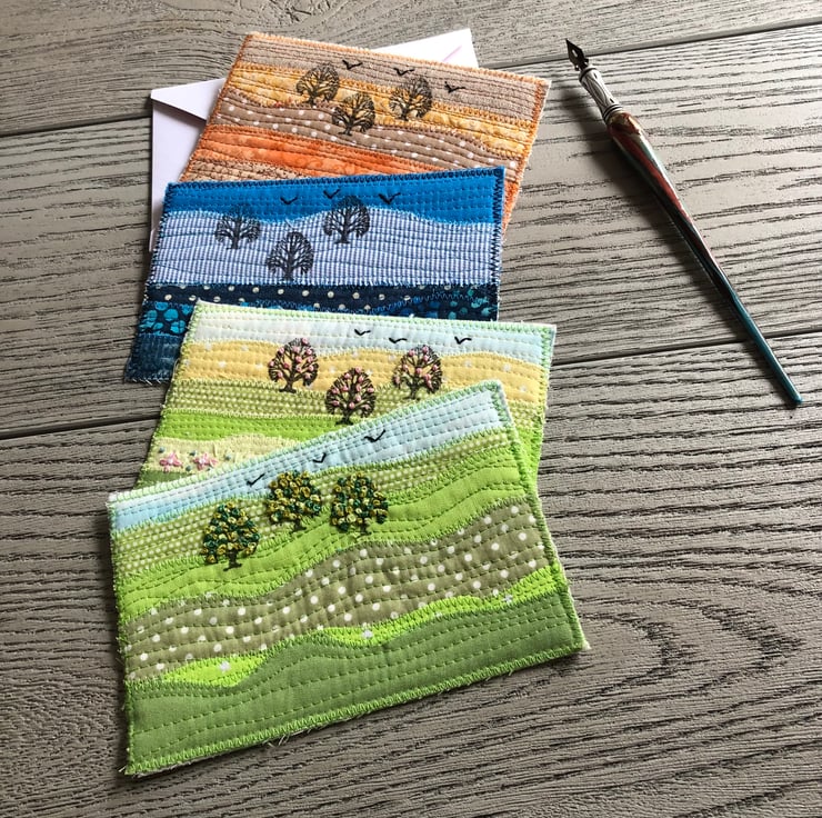 This set of 4 seasonal postcards is created from scraps of fabric, layered onto a piece of fabric with a fleece interfaced backing and stitched in place to give a quilted feel. Depending on the season the printed trees have embroidered leaves and blossom in colonial knots and flowers stitched in daisy and straight stitch. All postcards have embroidered birds in the sky.
