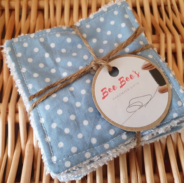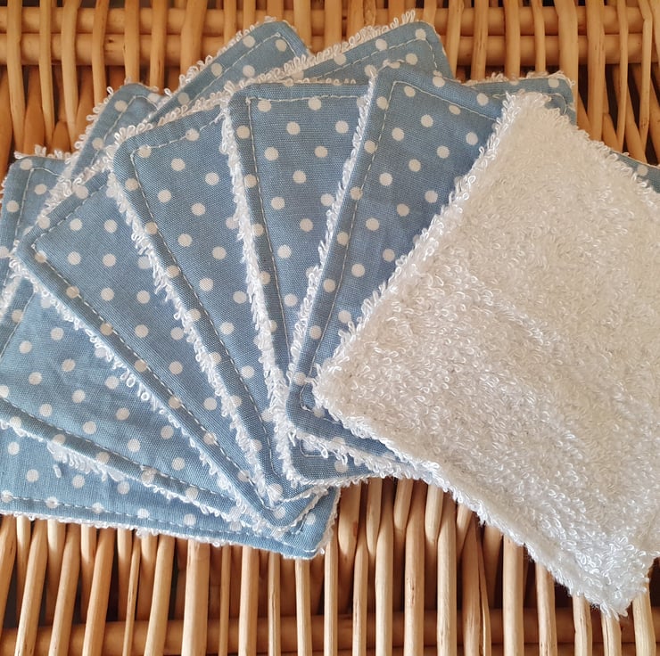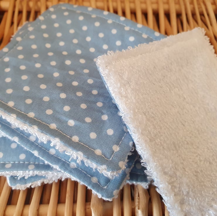 A set of seven handmade blue spot reusable fabric wipes, Ideal for light makeup removal as part of a skincare routine for cleanser and toner. Can also be used with water instead of baby wipes.