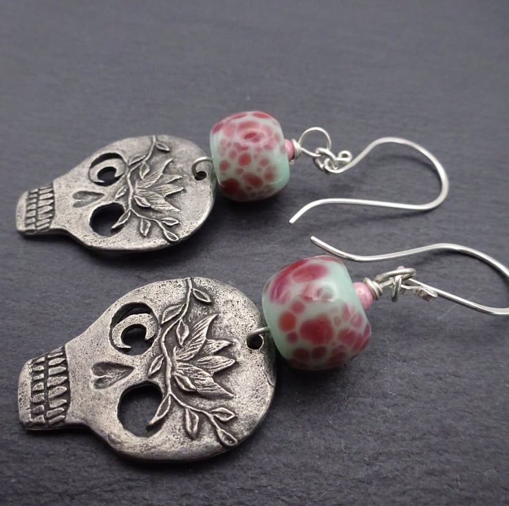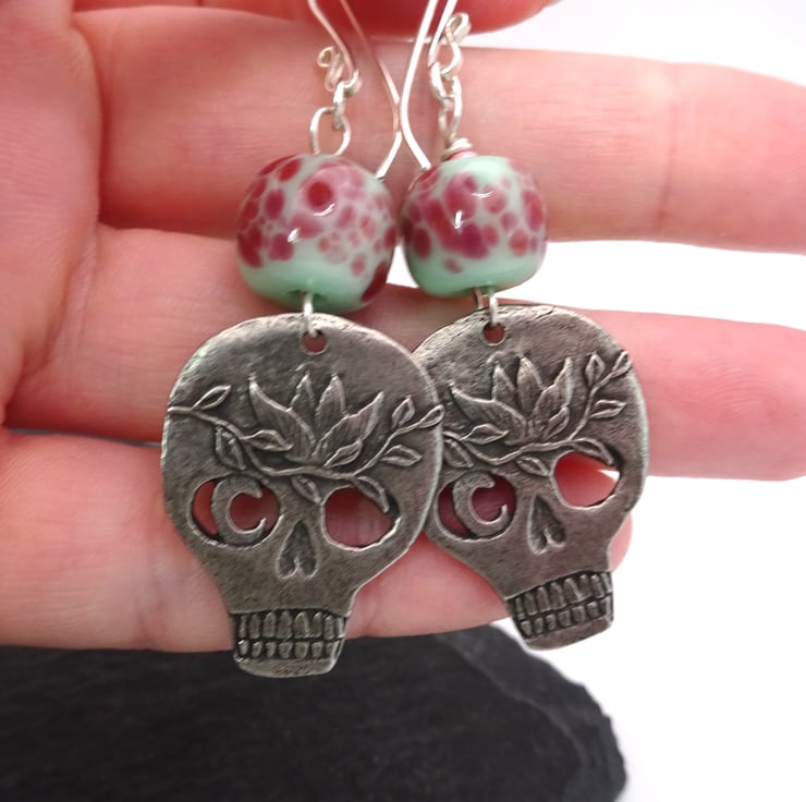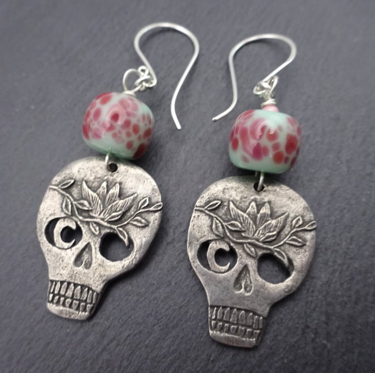 A pair of earrings made with handmade sterling silver ear wires, handmade lampwork glass beads and handmade pewter skull charms.