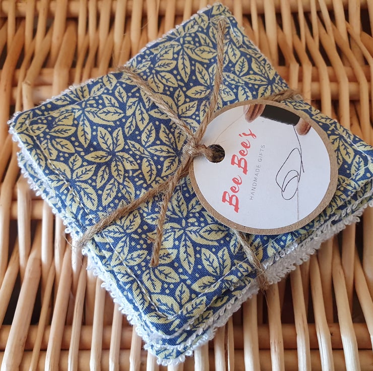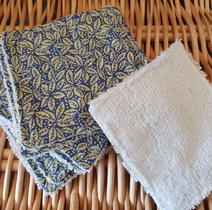 A set of seven handmade blue and gold leaf reusable fabric wipes, Ideal for light makeup removal as part of a skincare routine for cleanser and toner. Can also be used with water instead of baby wipes.