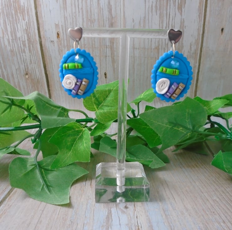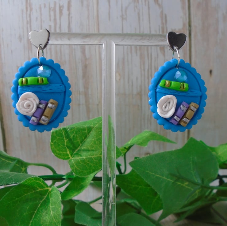 These beautiful earrings feature a unique design of tiny flowers, books & crystals made from clay with intricate details and texture that adds a touch of elegance.