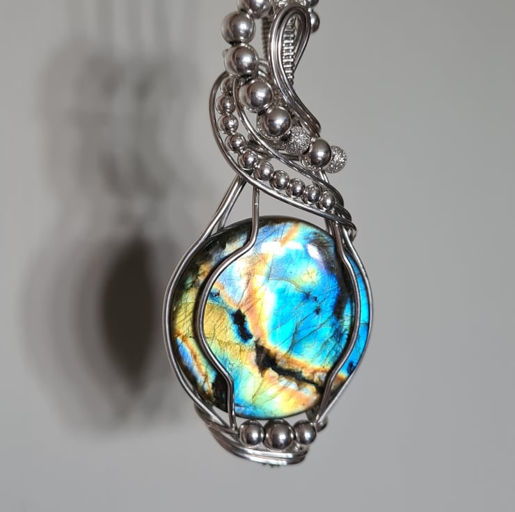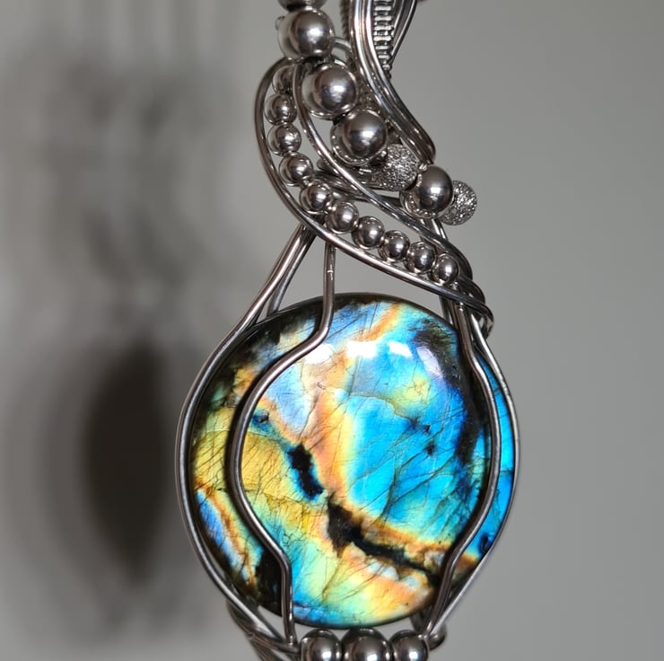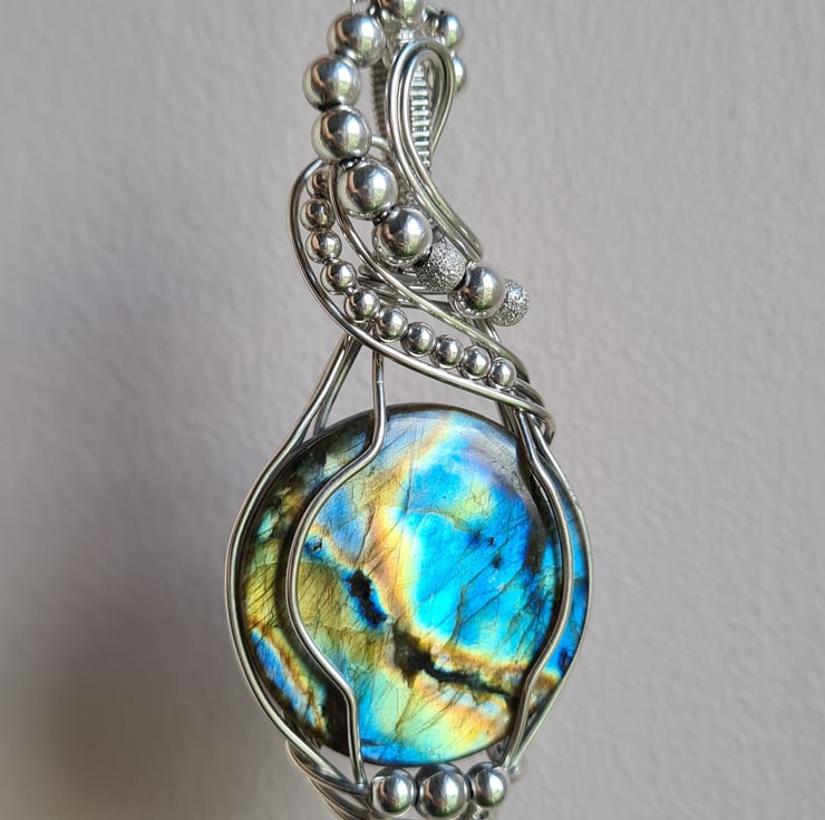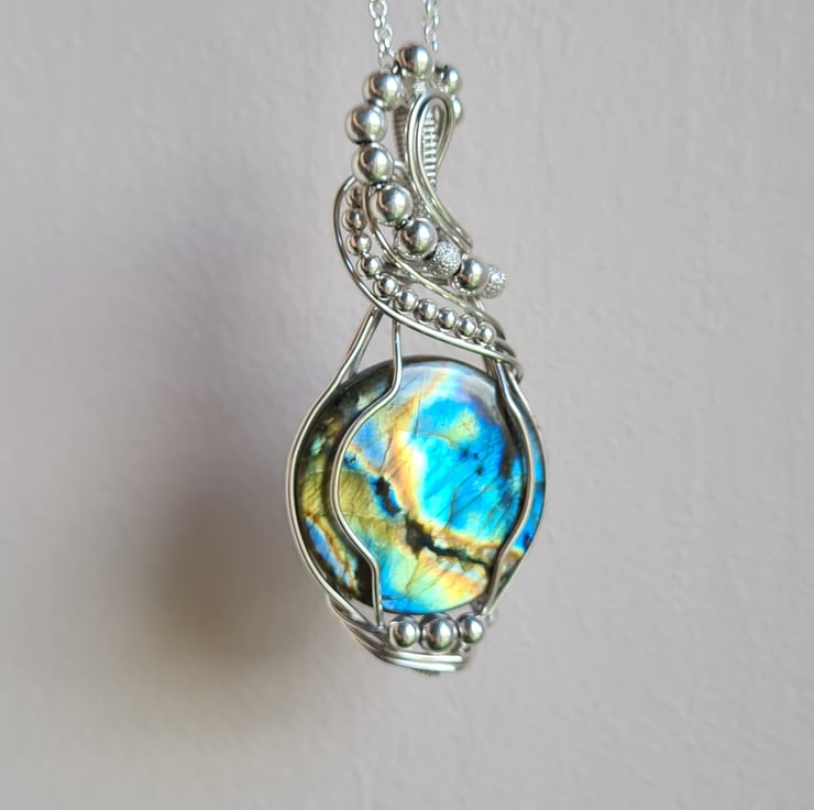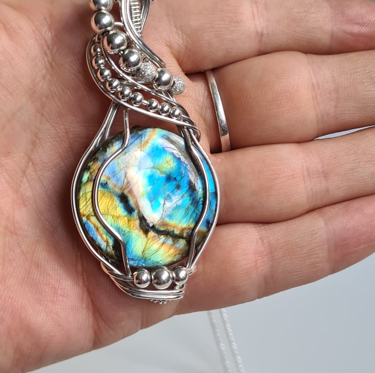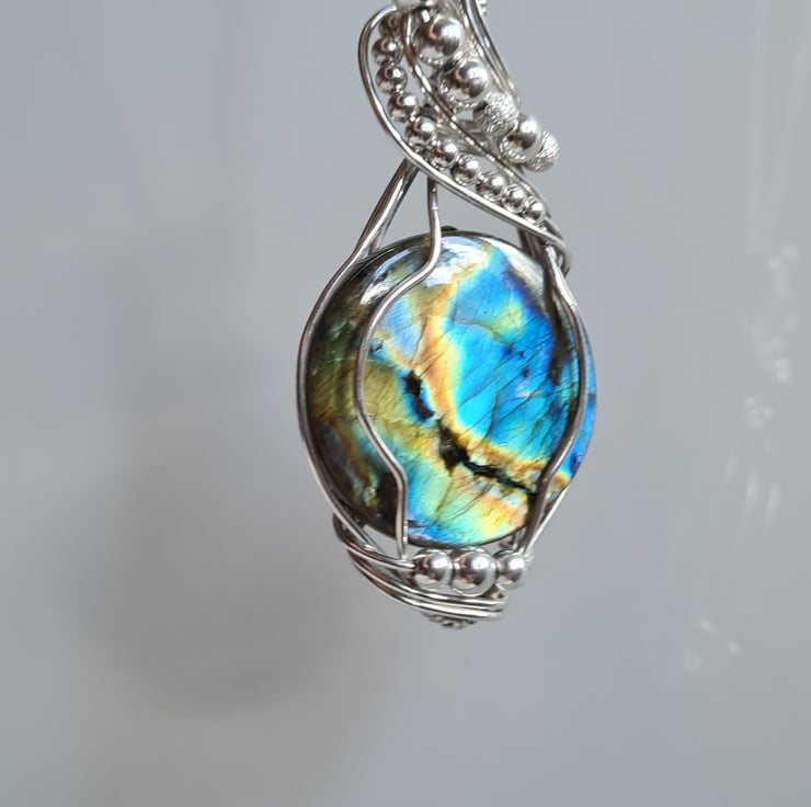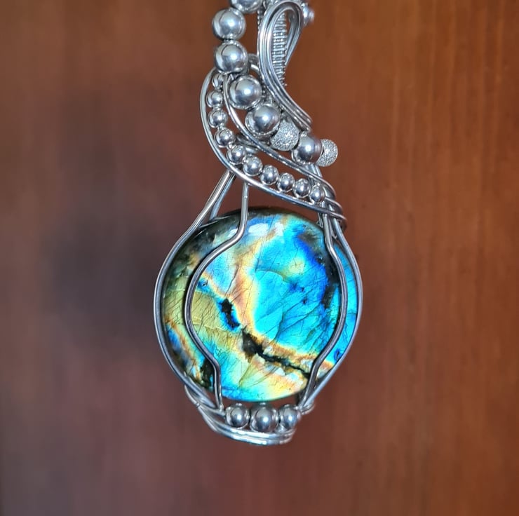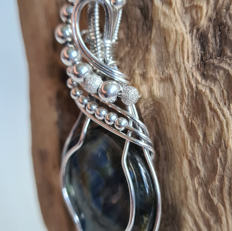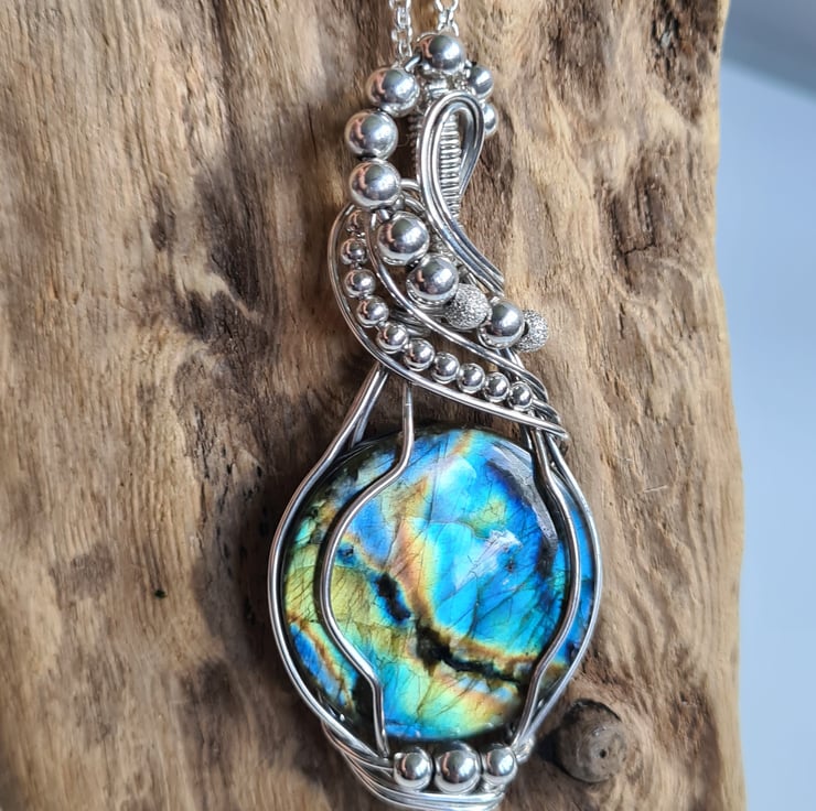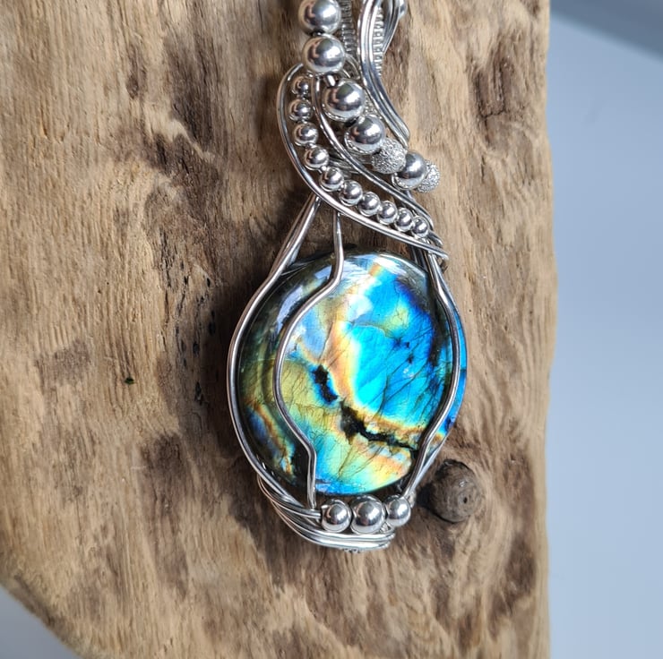 I have taken this gorgeous and very flashy Natural Labradorite and wrapped it with 925 Sterling Silver into this unique design, and finished with Sterling Silver beads. This is a large statement piece and would make a lovely one of a kind gift for that special someone in your life, or a lovely treat for yourself!