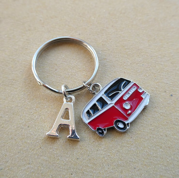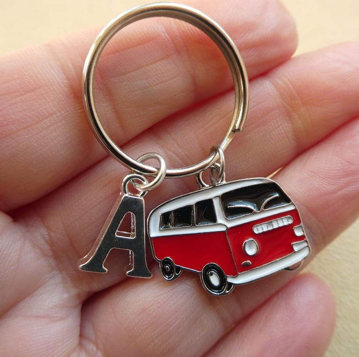 Fabulous keyring featuring a red and black enamel campervan with or without initial. Great gift idea for Volkswagen fans.