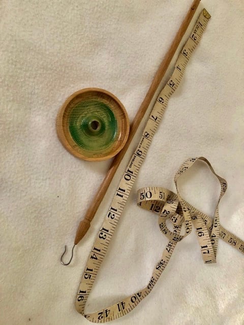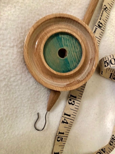 A drop spindle and shaft all in hand turned Oak, the spindle is 14" plus the stainless steel hook. The whorl is 3" diameter and weighs 32 grams, the shaft another 20 grams. I have turned the whorl with most of the weight in its perimeter for good spin and added coloured stain for effect