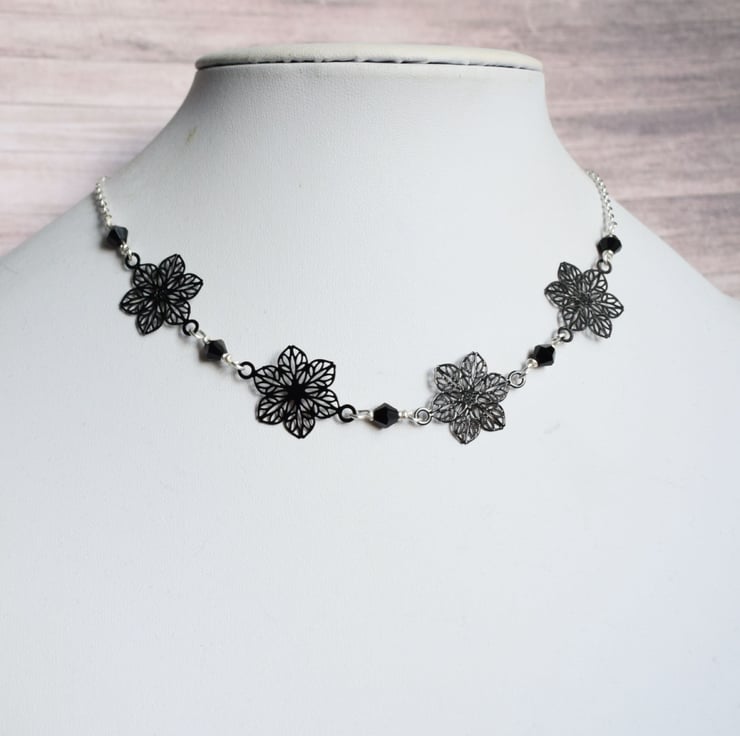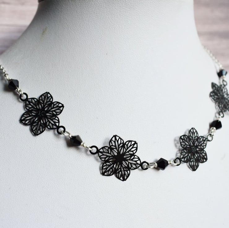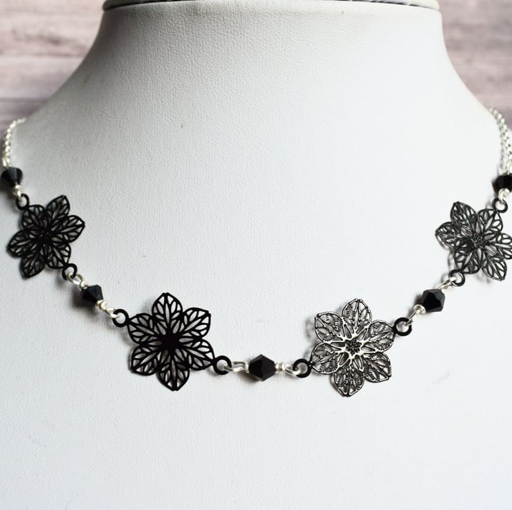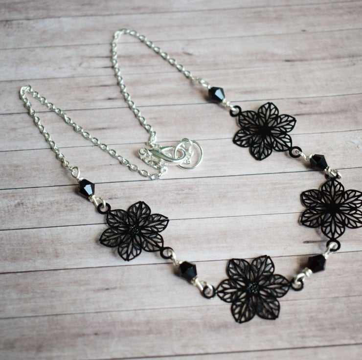 This pretty black filigree flower necklace has an understated elegant feel to it probably because of the lacy look of the flowers just linked together with glossy black glass beads.