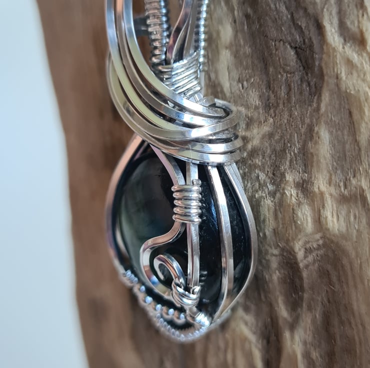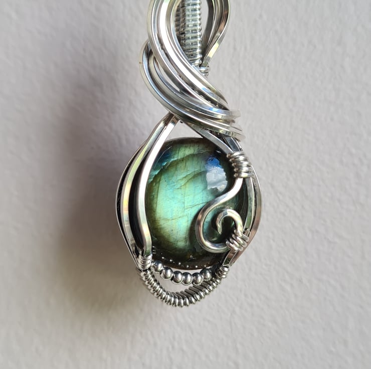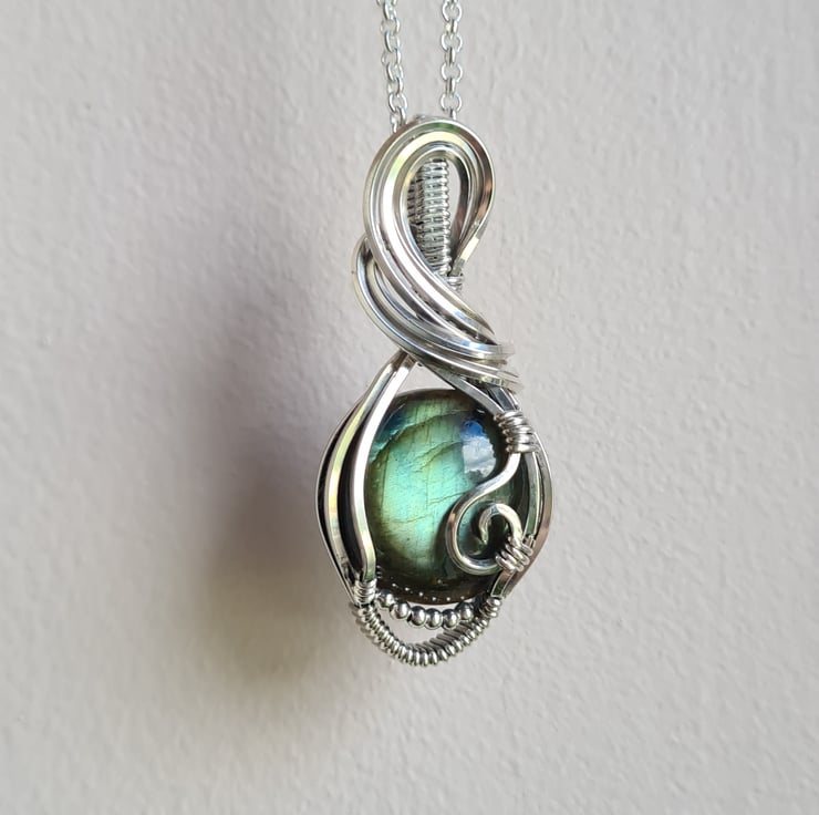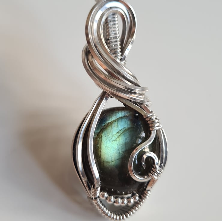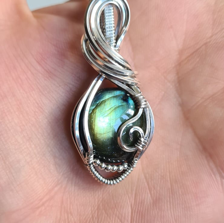 This lovely Natural Labradorite stone is a beautiful flashy sea green and blue mix and I have wrapped it in 925 Silver and finished with little Sterling Silver beads to create this lovely elegant design. This stone has such a beautiful depth of colour and tone and looking at its colour and flash is like watching the ocean.