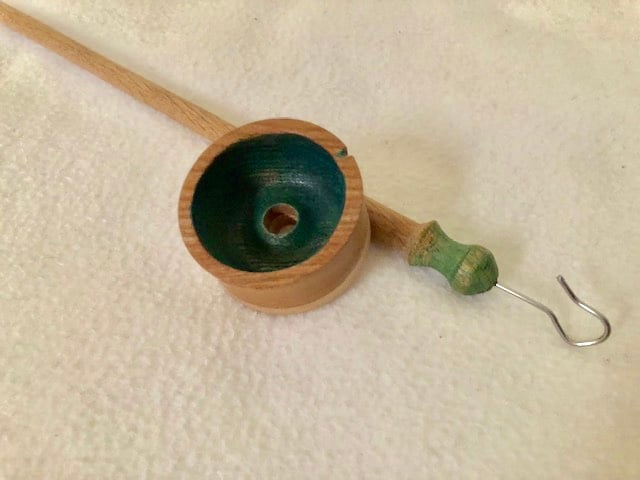 A mixed hardwood drop spindle 12" long (plus hook), the shaft is 16grams and tapered hardwood while the whorl is 2" dia and weights 21 grams and heavily undercut to place most weight onto the perimeter. I make my own stainless steel hooks. All finished with hard wax.