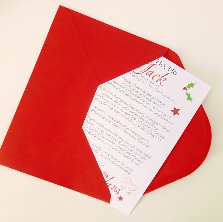 Letters come printed on high quality 300gsm A5 size card (approximately 5.83 x 8.27") with bright red envelopes.