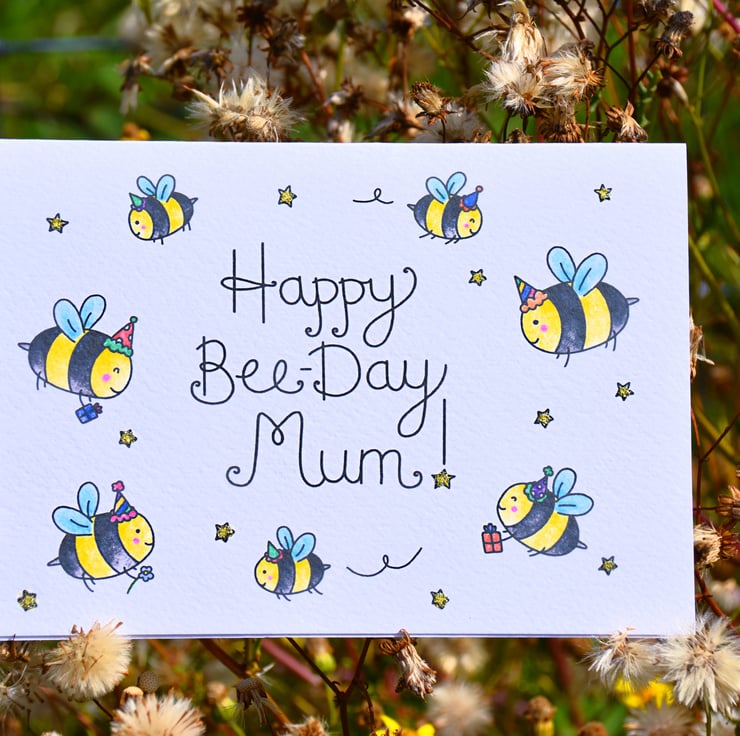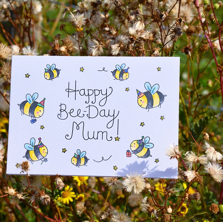 Wish your lovely mum a very happy bee-day! This A6 bee-autiful birthday card is handprinted on textured card and glittered by hand.