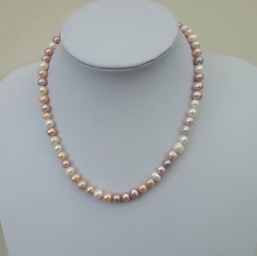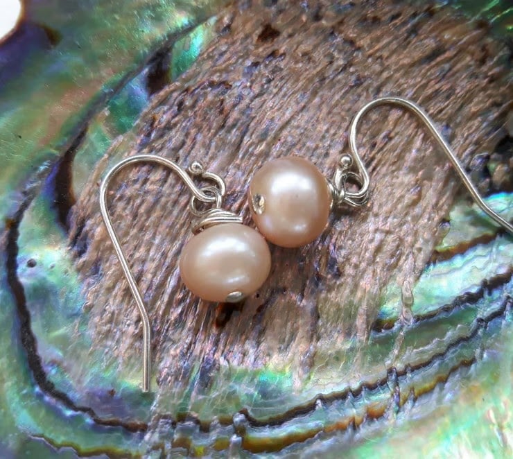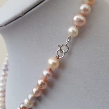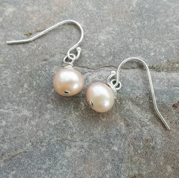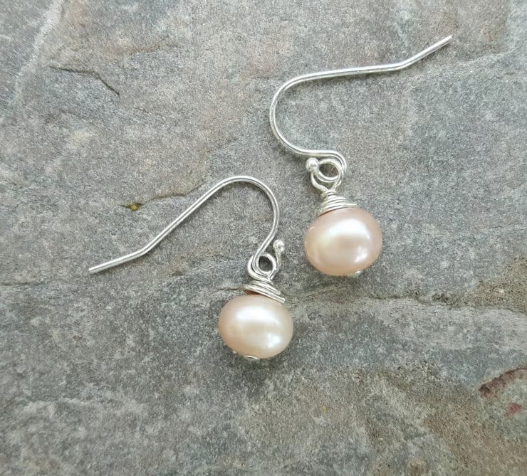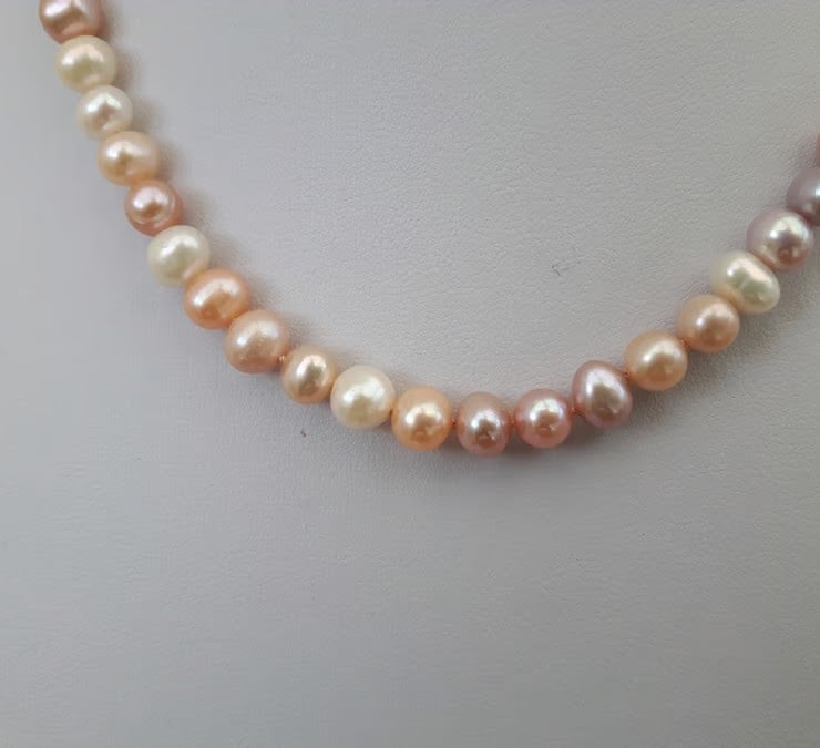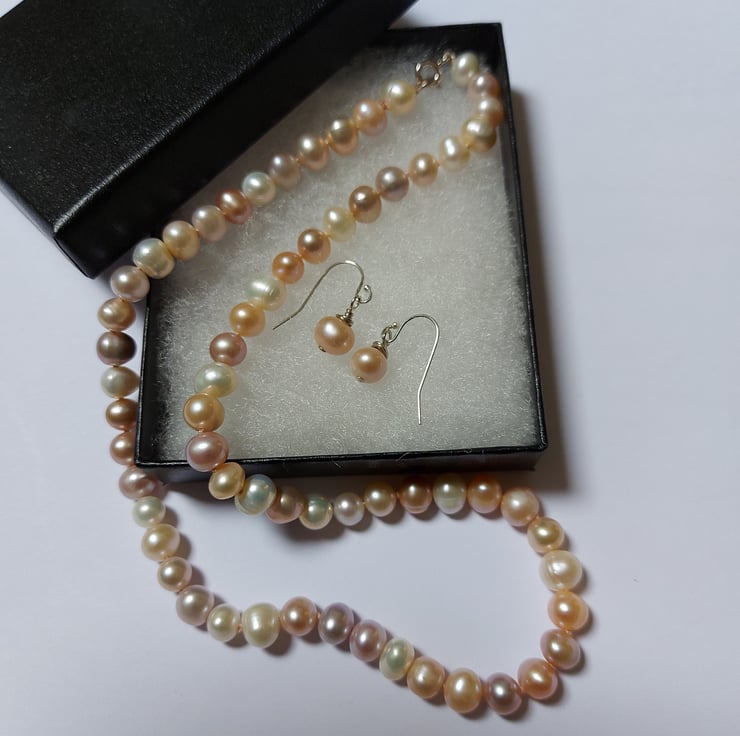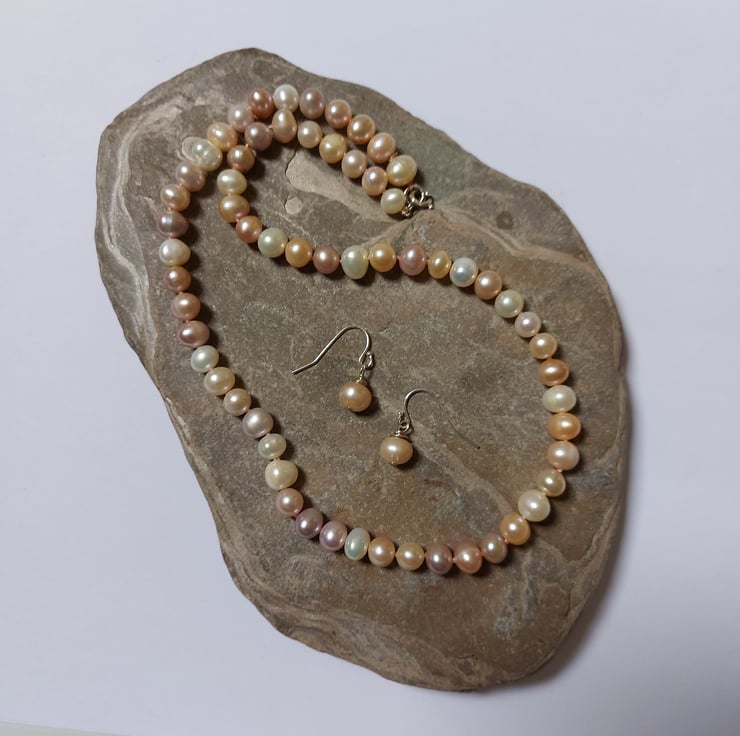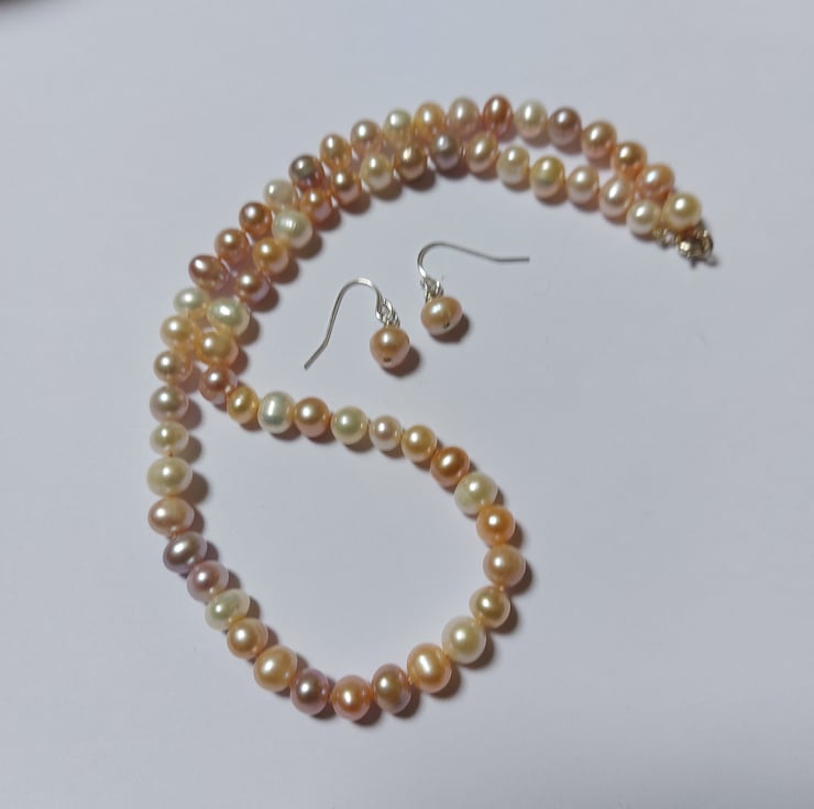 This pretty jewellery set comprises a peach-coloured freshwater pearl necklace with matching drop earrings. Ideal to wear to a wedding or as a gift for a friend. The pearls are about 7mm in diameter, round to slightly ovoid in shape and have been hand-knotted onto pink beading silk. They range in colour through shades of peach, pink and cream. The necklace is 17 inches long and fastened by a bolt and ring clasp made of sterling silver. The matching earrings are a dangle-drop style with a single pearl mounted on a silver headpin and silver ear-hooks.