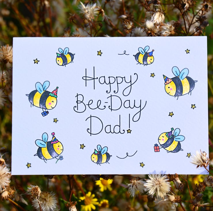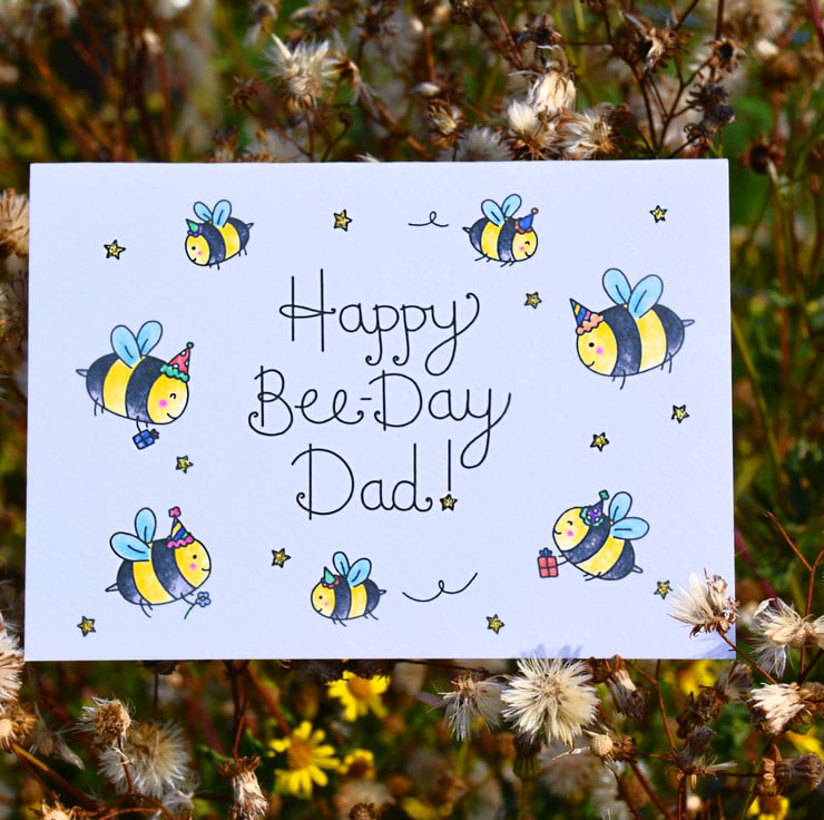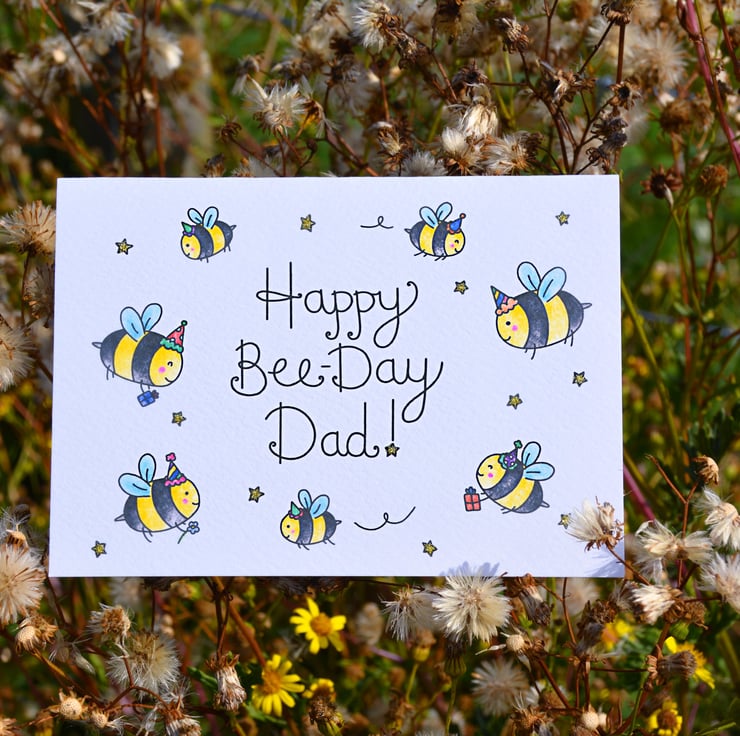 Wish your lovely dad a wonderful bee-day! This A6 birthday card is handprinted on textured card and glittered by hand.
