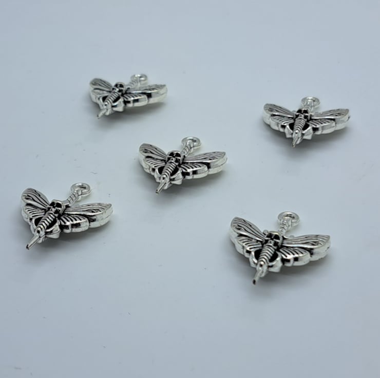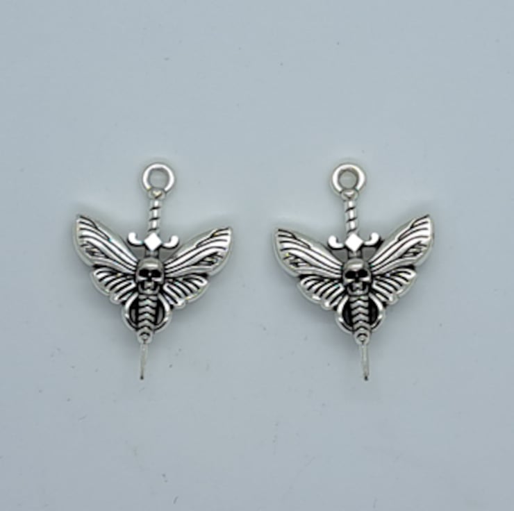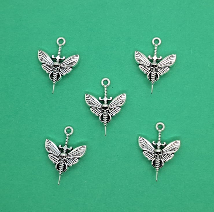 5 Moth with skull head and dagger charms, antique silver effect.