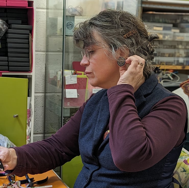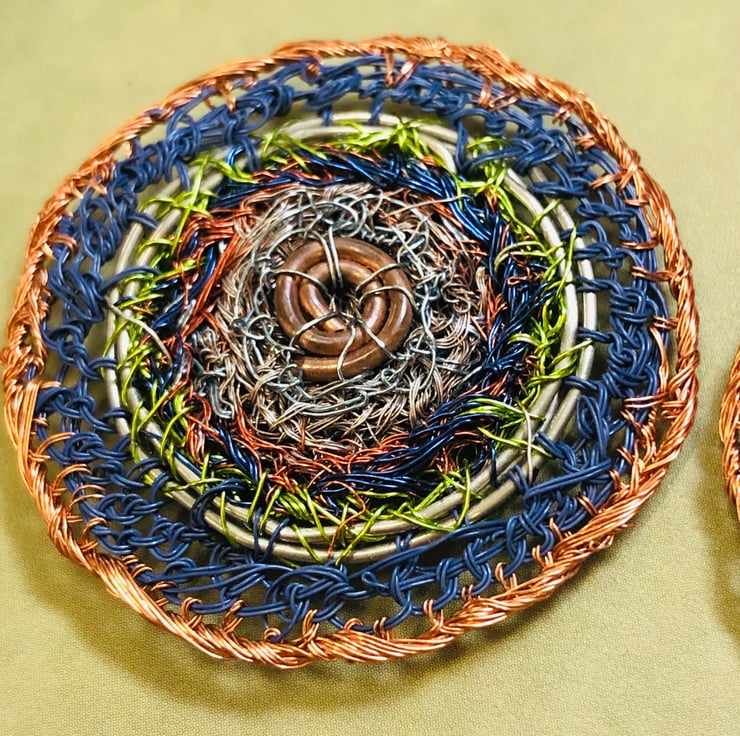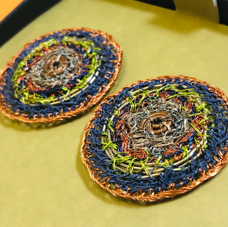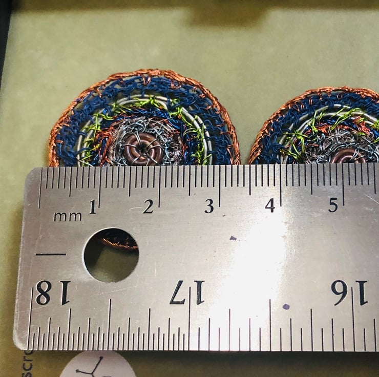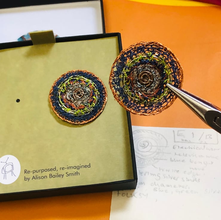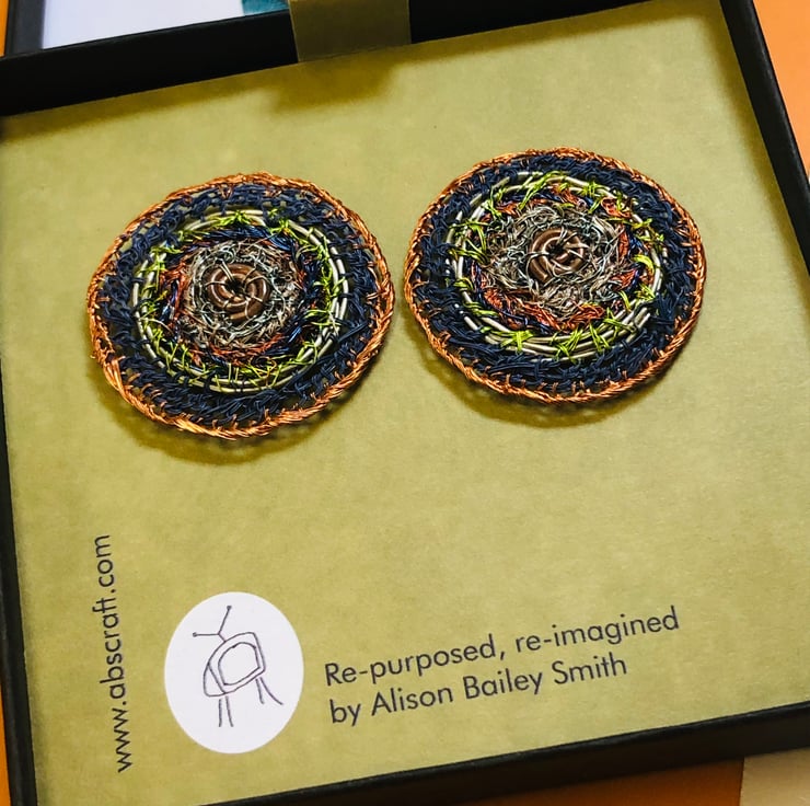 Large round sterling silver studs of recycled materials made by Alison Bailey Smith in Wirral with wire recycled from old televisions and bought wire with sterling silver studs. With special gift box with branded cards.