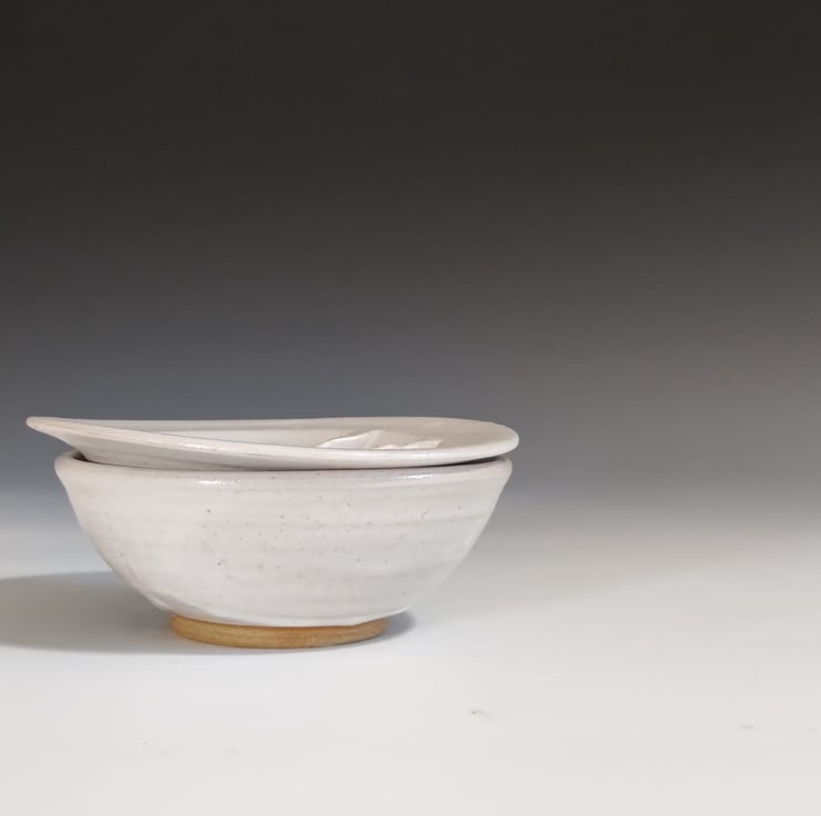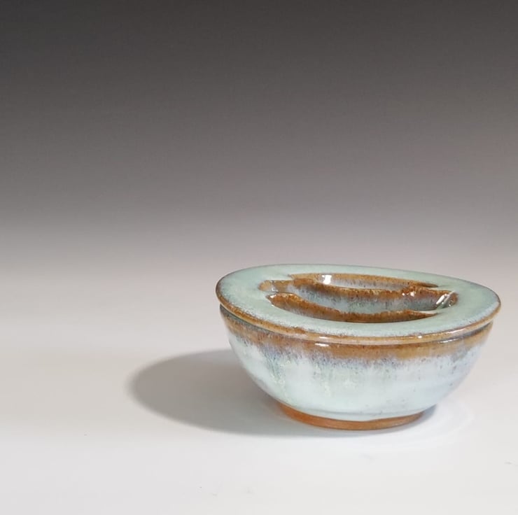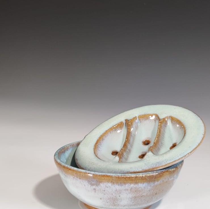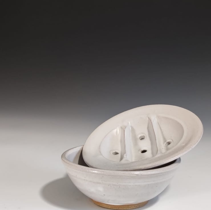 This soap dish has been designed to keep your soap dry between washes. I always find it off putting when you go to use the soap and it has been sitting in a pool of water and turned to mush. This soap dish took a few prototypes to get it to work but this final version works really well. It has a top part which allows water to drain into the bowl underneath. This bowl can easily be emptied once it is full. Also it is dishwasher safe should it need a clean, Because of how they are made there is inevitable warping of the top part of the soap dish but this does not affect its functionality in anyway. There are two colour available, white and pale blue. Height 6cm approx Width 12cm approx
