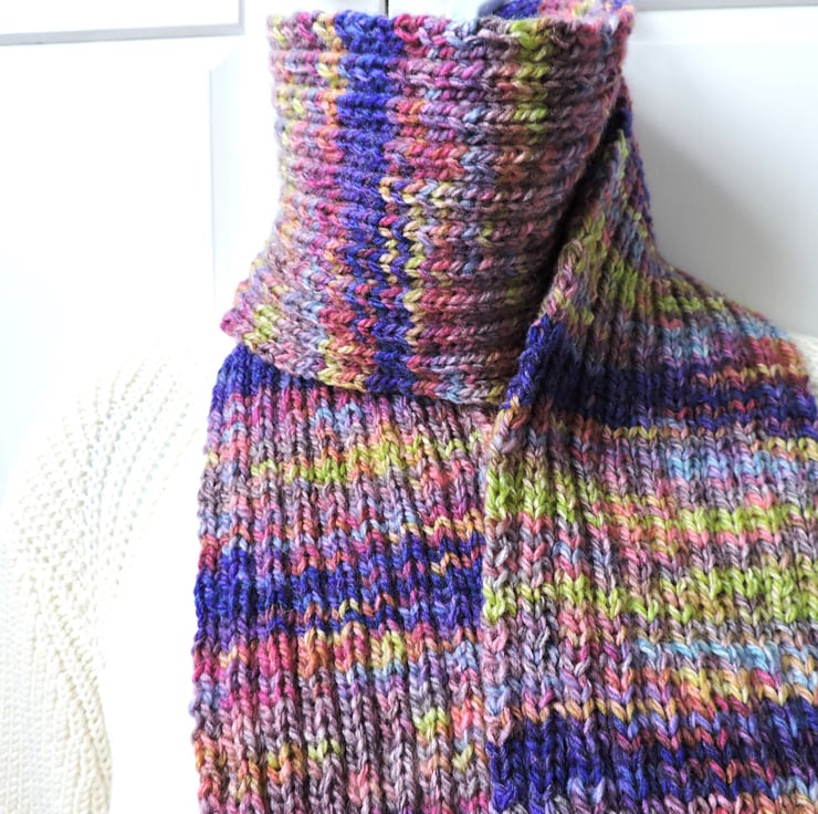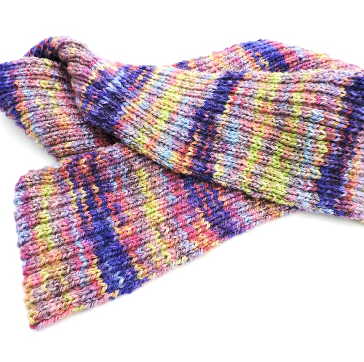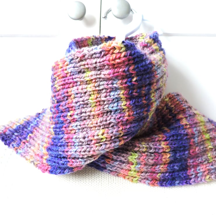 This colourful scarf has been knitted with chunky knit acrylic yarn. A double rib pattern has been used. A multicoloured self striping yarn of purple, pink, lime, pale yellow, peach and blue which is soft and warm making it ideal for the coming cooler months..