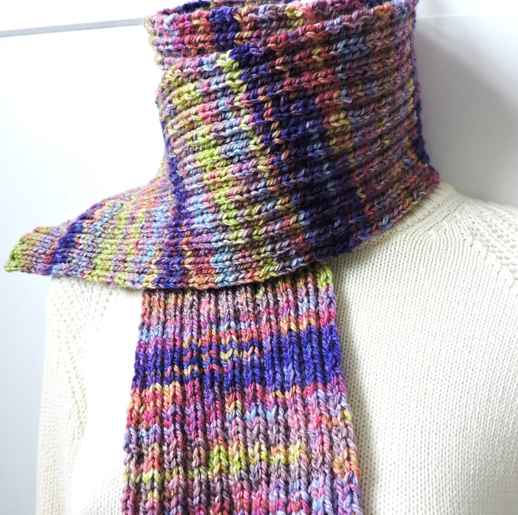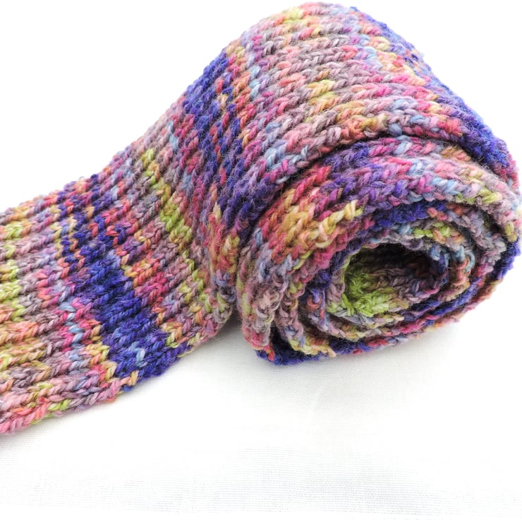 This colourful scarf has been knitted with chunky knit acrylic yarn. A double rib pattern has been used. A multicoloured self striping yarn of purple, pink, lime, pale yellow, peach and blue which is soft and warm making it ideal for the coming cooler months..
