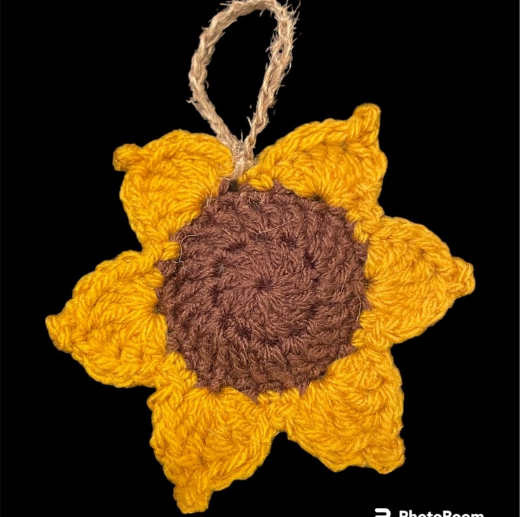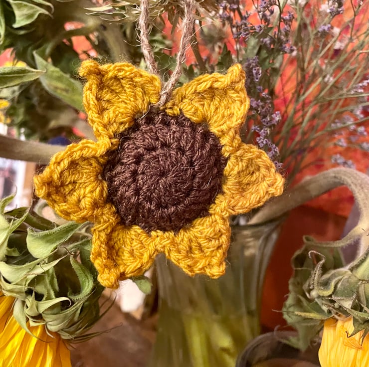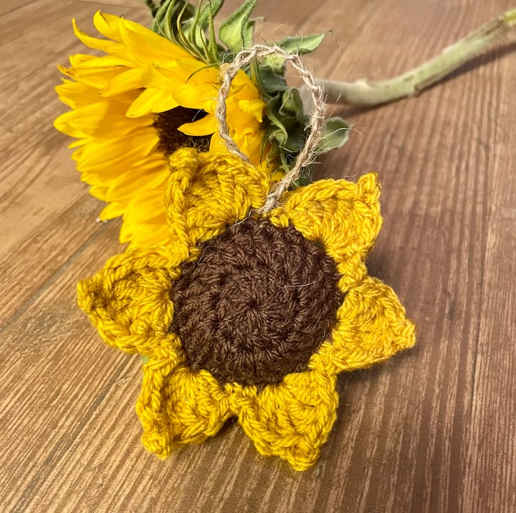 Each sunflower measures approximately 10 cm across and has a crochet twine hanger loop.