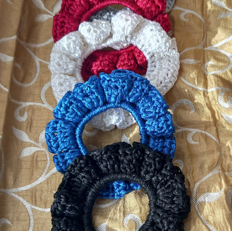 A stunning collection of scrunchies, in five different colours to match all your party outfits. Made with ribbon yarn, they have a beautiful lustre. Wear them in your hair or even as a bracelet. These scrunchies will add that touch of class to the Christmas party season.