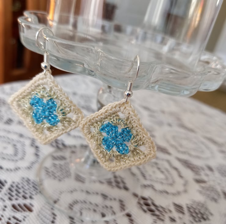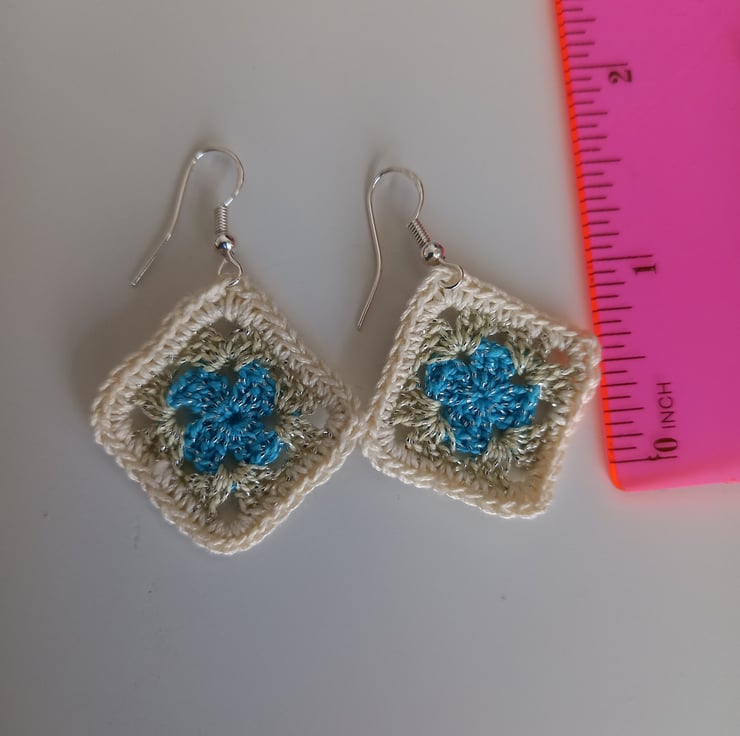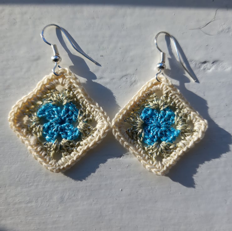 Very stylish and in fashion at the moment, these blue and white crochet granny square earrings will make a statement whenever you wear them. Made with 100 percent cotton yarn and sterling silver.