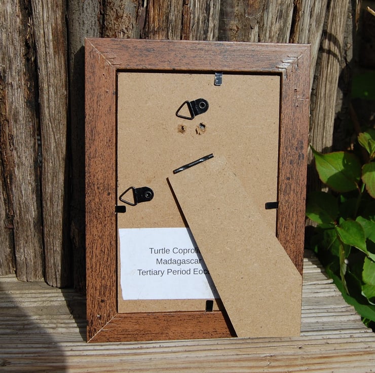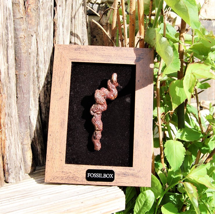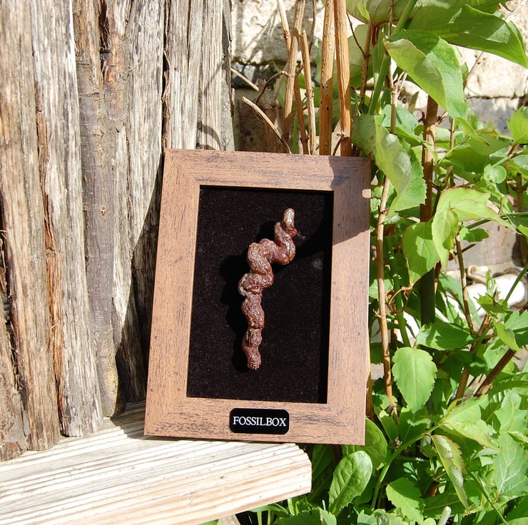 Lovely piece fossil poo! Can be removed and handled! Mounted in a light wooden frame on a plush black background.