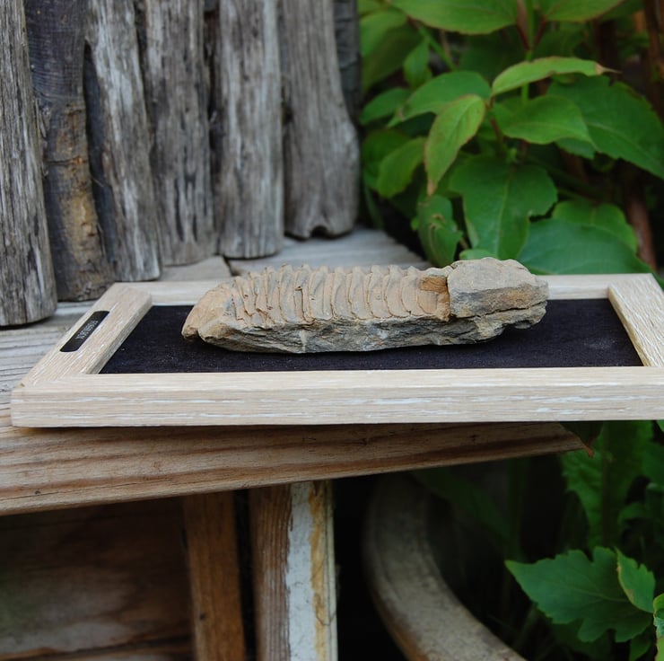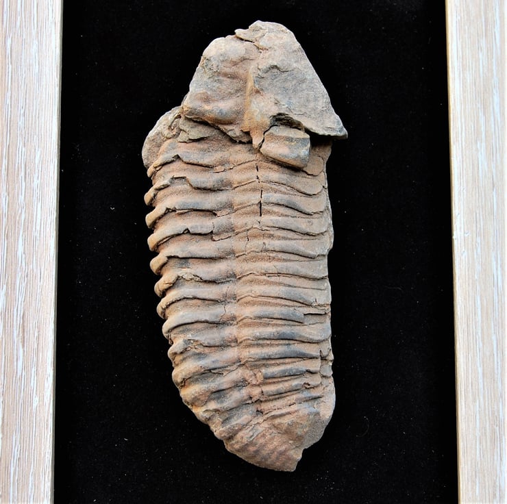 Moroccan trilobite tail displayed in a light wood frame on aplush black background.