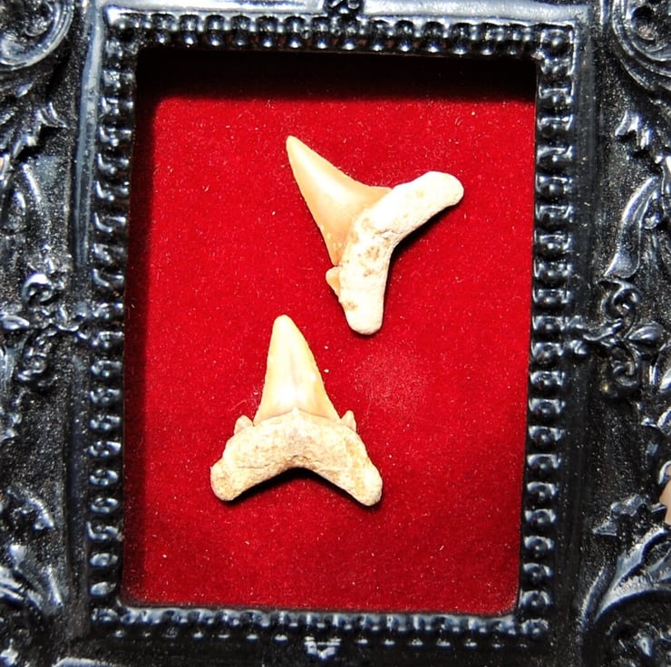 Our popular small decorative gothic frames with Two Eocene Otodus(mackerel shark, forerunner of the great white) shark teeth.
