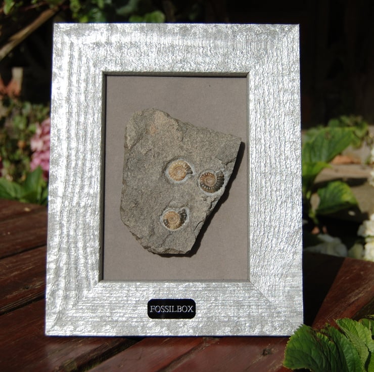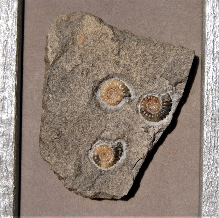 Three lovely Dorset ammonites in matrix mounted in a modern shaby chic style grey frame on a plush grey background.