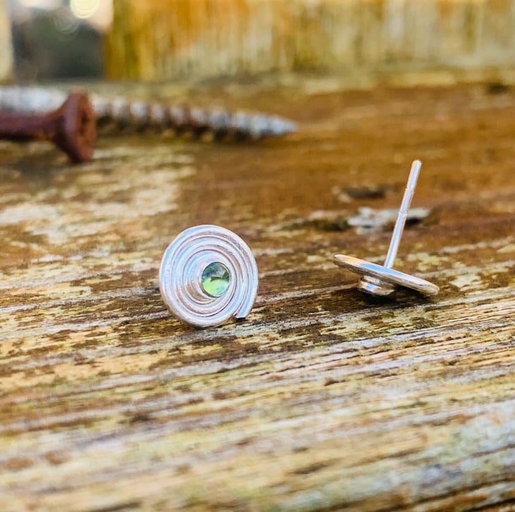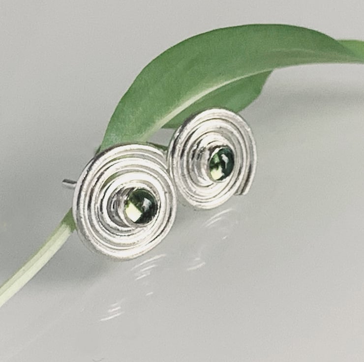 Handmade Spiral stud earrings set with a little 3 mm Tourmaline
