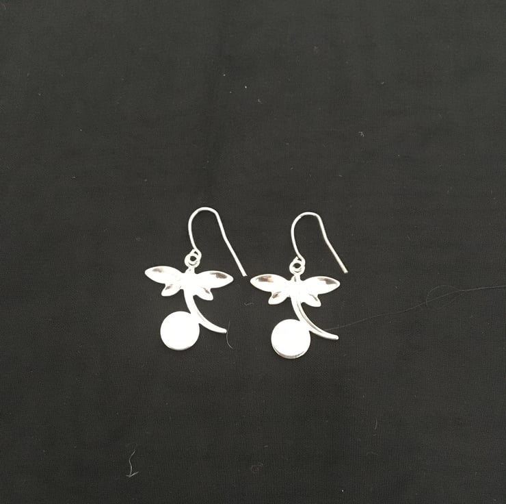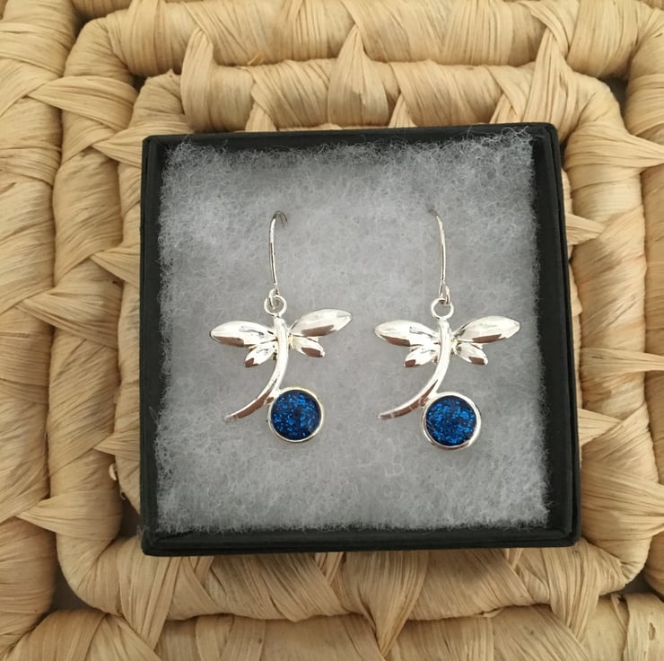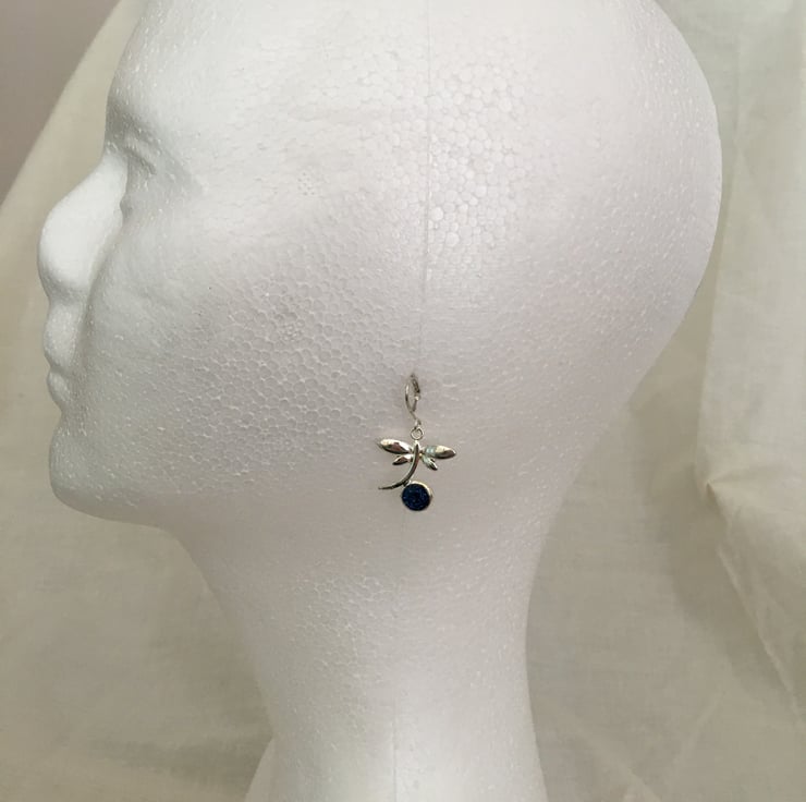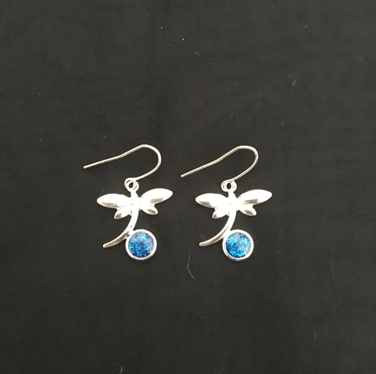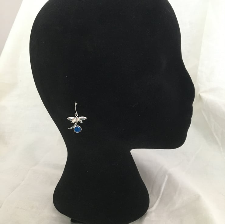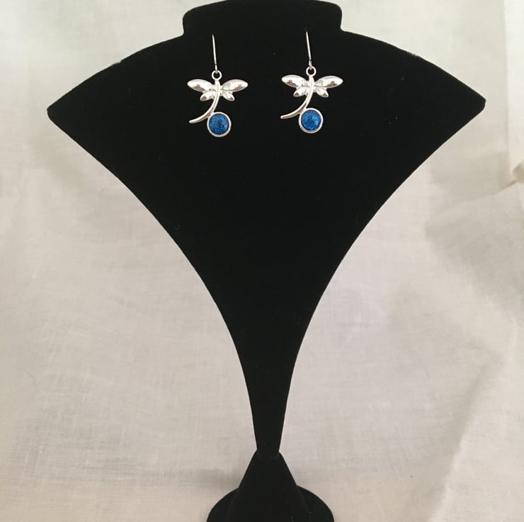 Pretty handcrafted blue centred dragonfly earrings in a quality silver plated setting.