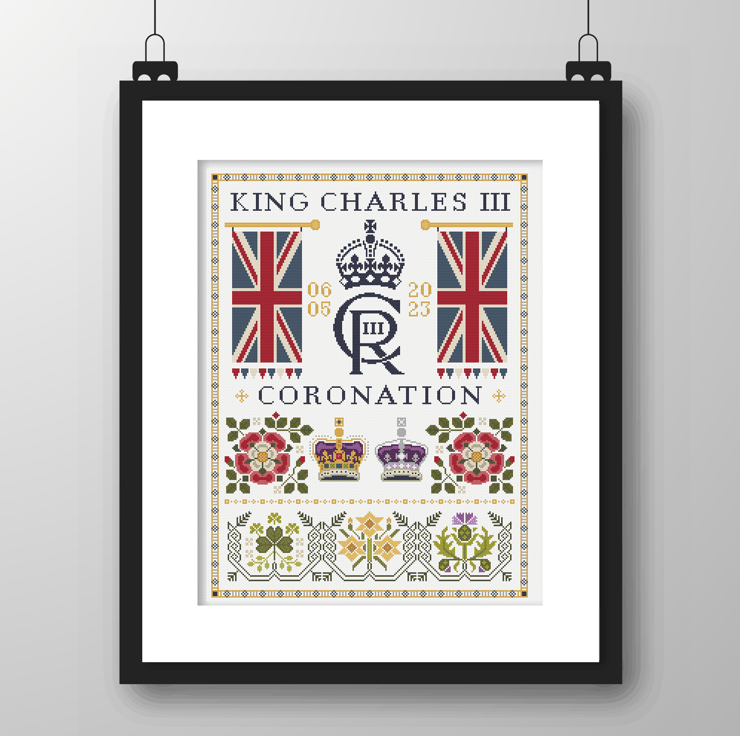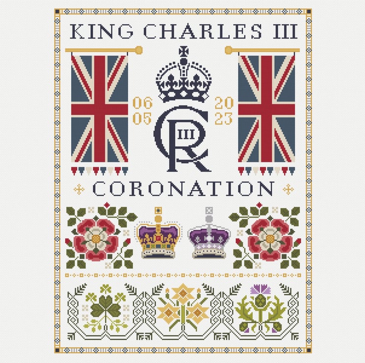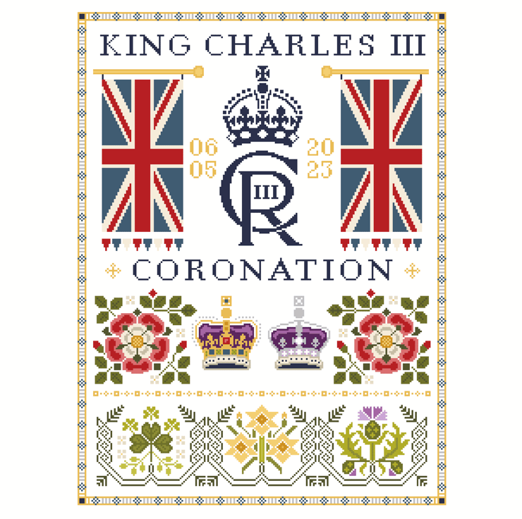 Cross Stitch Sampler to commemorate HM King Charles III Coronation 6 May 2023 with Royal crowns of the King and Queen. Tudor Rose, Thistle Daffodil and Shamrock counted chart 151
