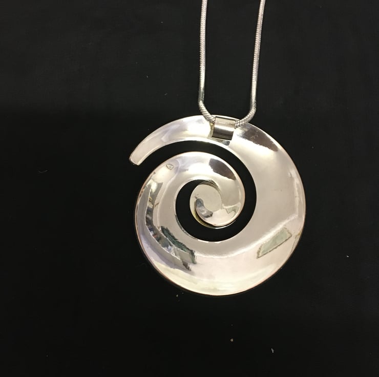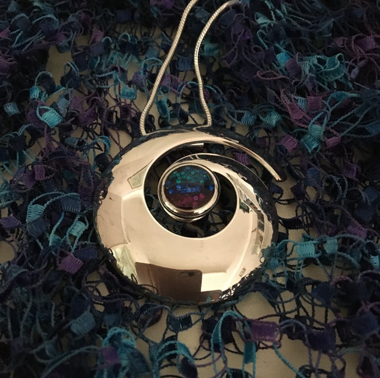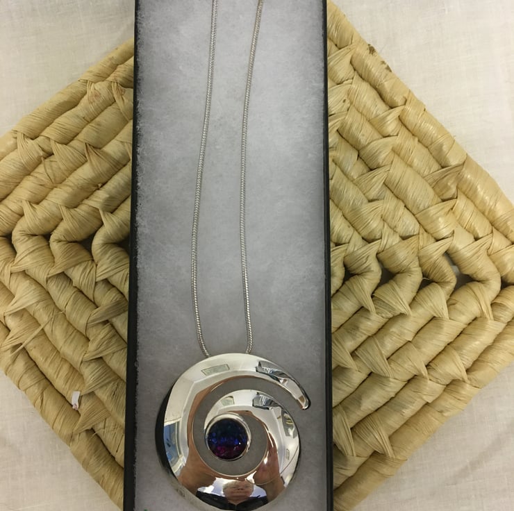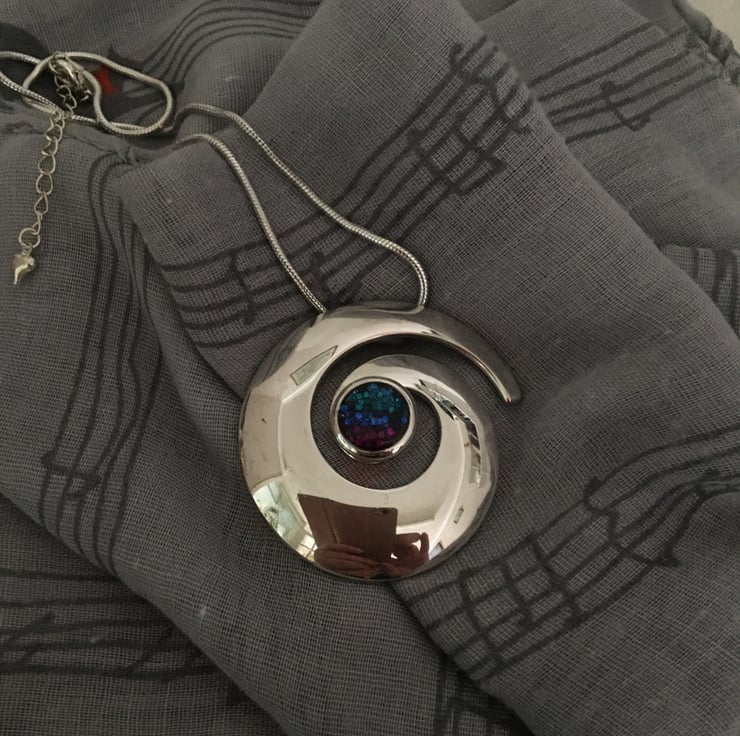 Bold eyecatching handcrafted tri-coloured swirl pendant in a quality silver plated setting.