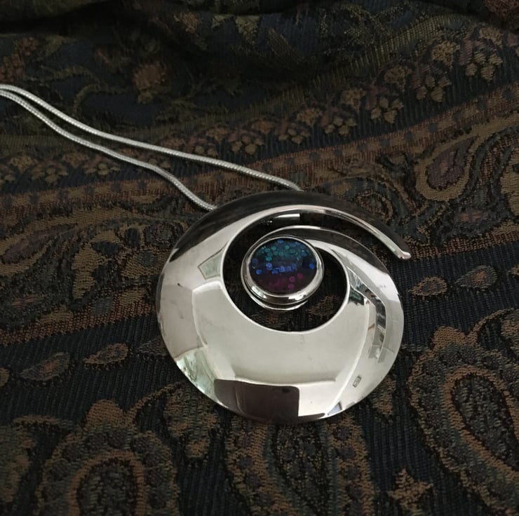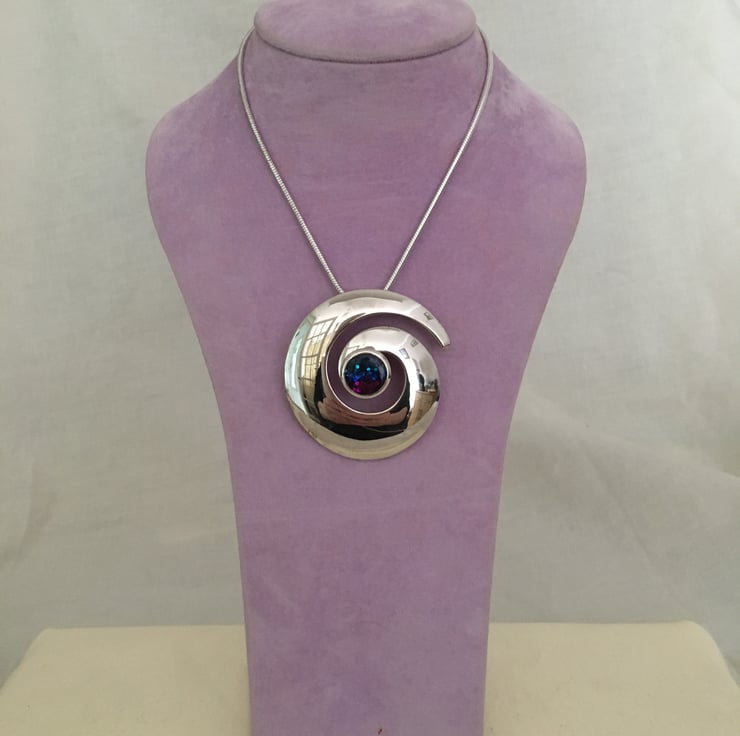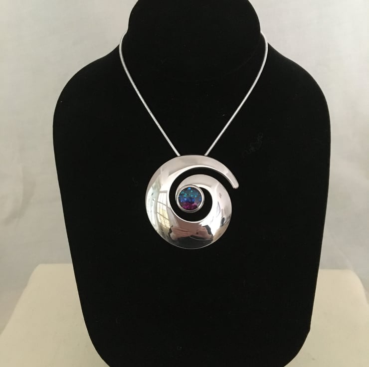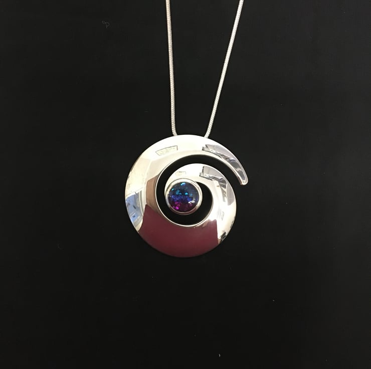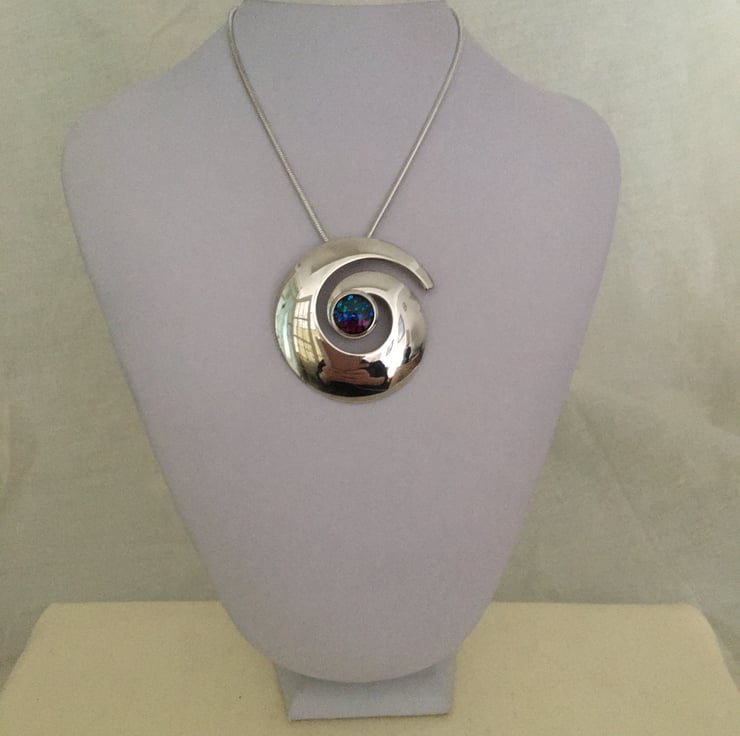 The colours gently reflect the light with a hint of a shimmer and therefore can be worn as day or evening wear. This looks stunning with an outfit that reflects the colours of the pendant.