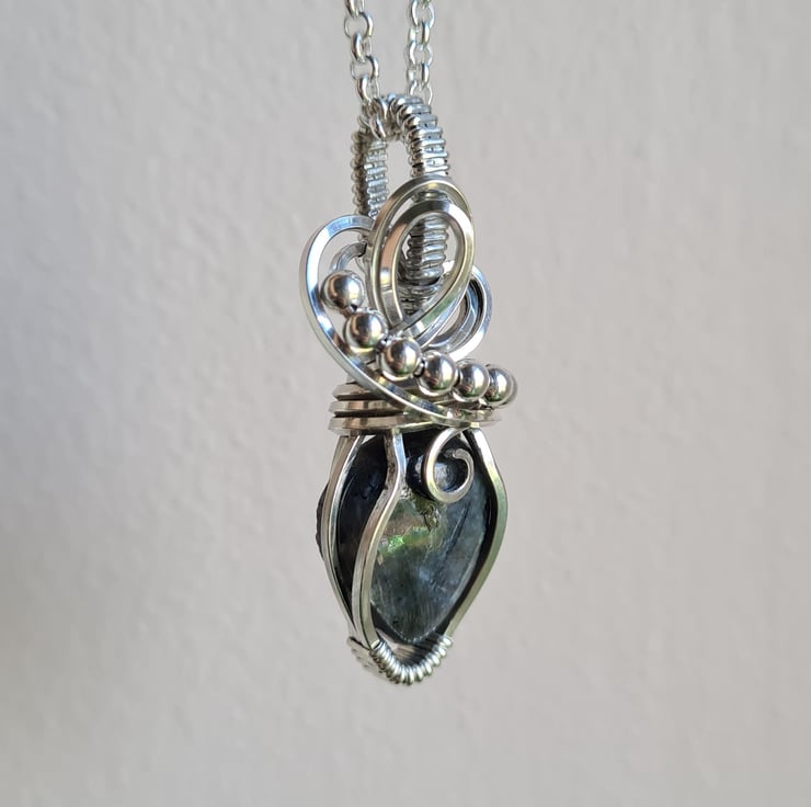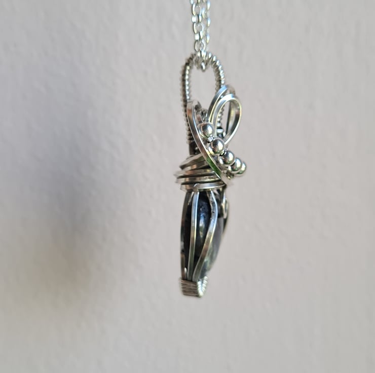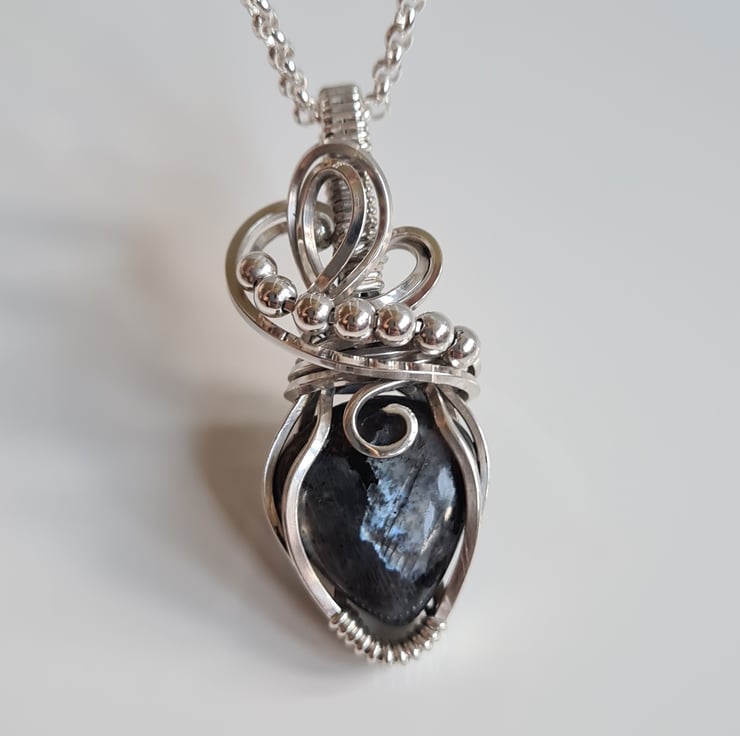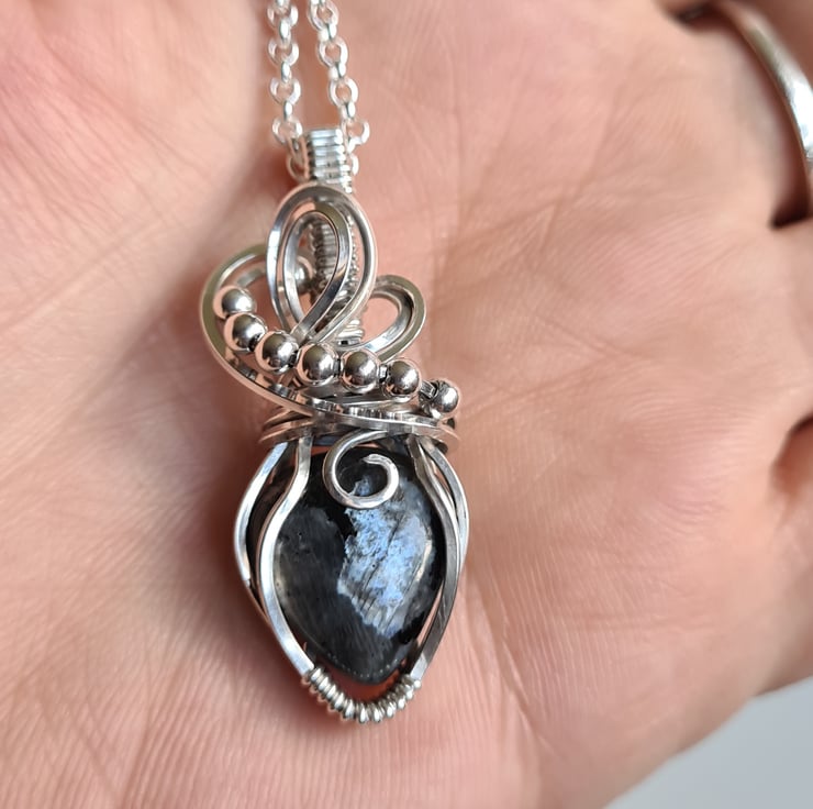 I have taken this absolutley lovely little Natural Larvikite stone and hand wrapped it entirely in 925 Silver and finishing with cute little Sterling Silver beads, into this elegant and classy design.