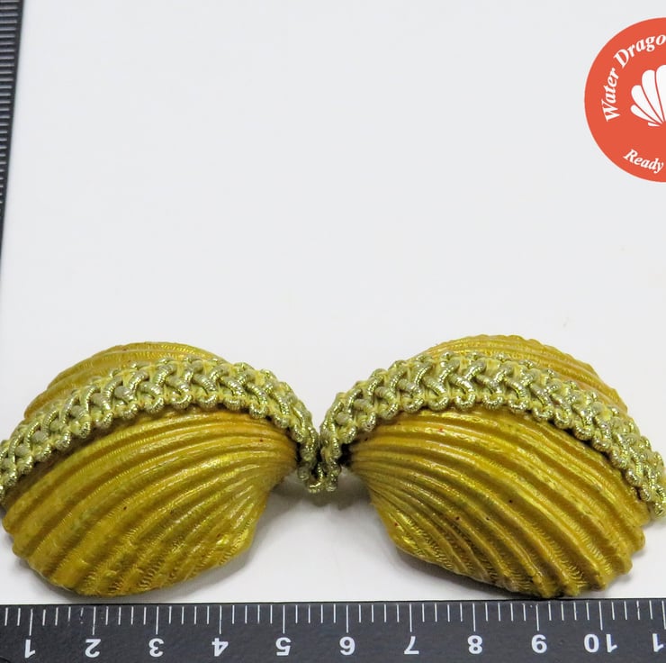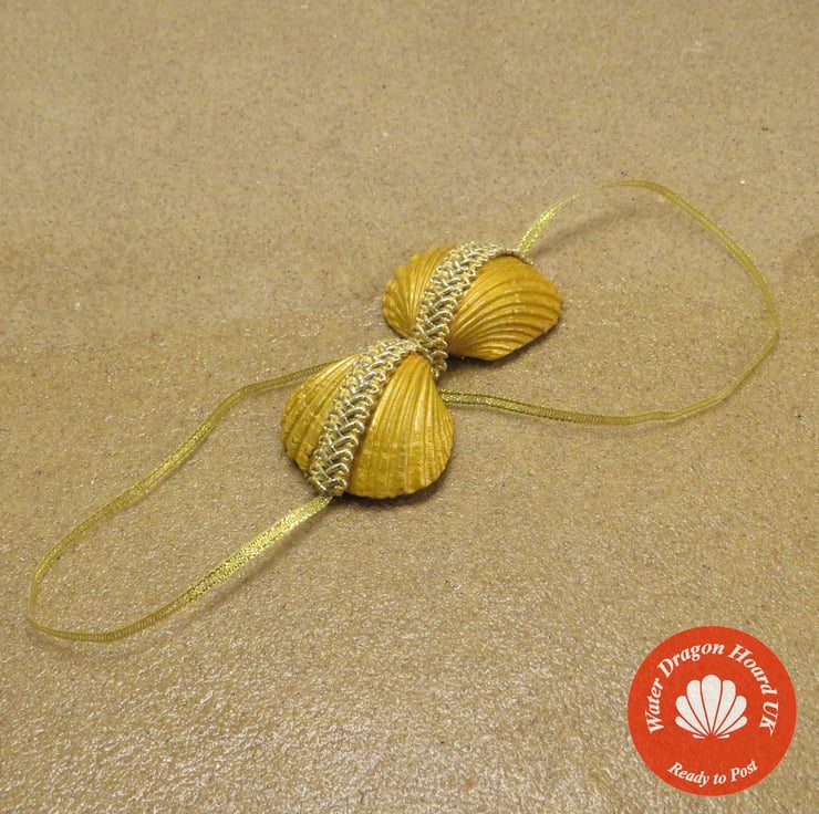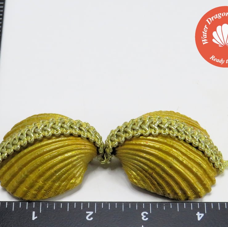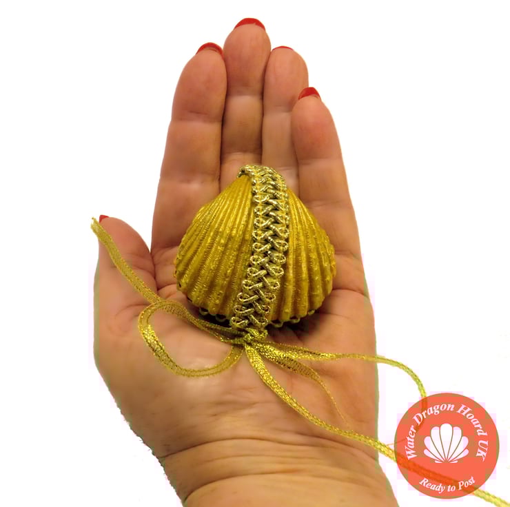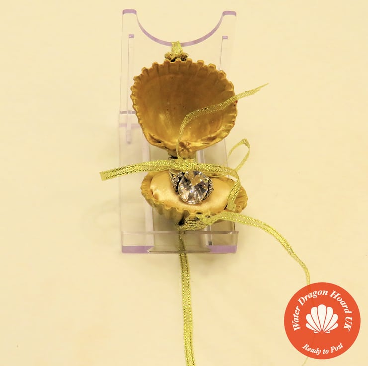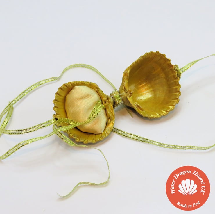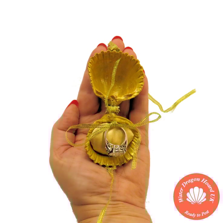 This beautiful and elegant naturally hinged cockle shell can hold one ring, has been painted with gold acrylic paint, varnished, and adorned with golden braid.