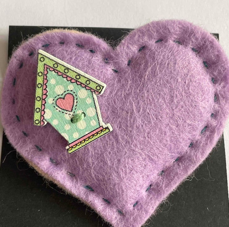 Handmade lilac felt heart brooch with Birdhouse Detail