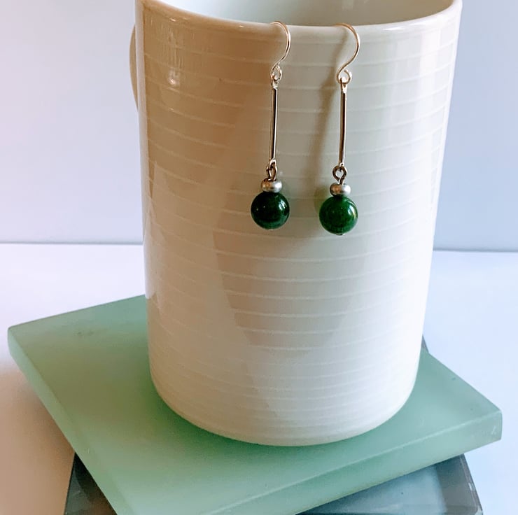 Emerald glass bead earrings with silver mini metalic rochelles. Hanging from stainless steel rod pins on Silver plate ear wires. Alloy and nickle free,