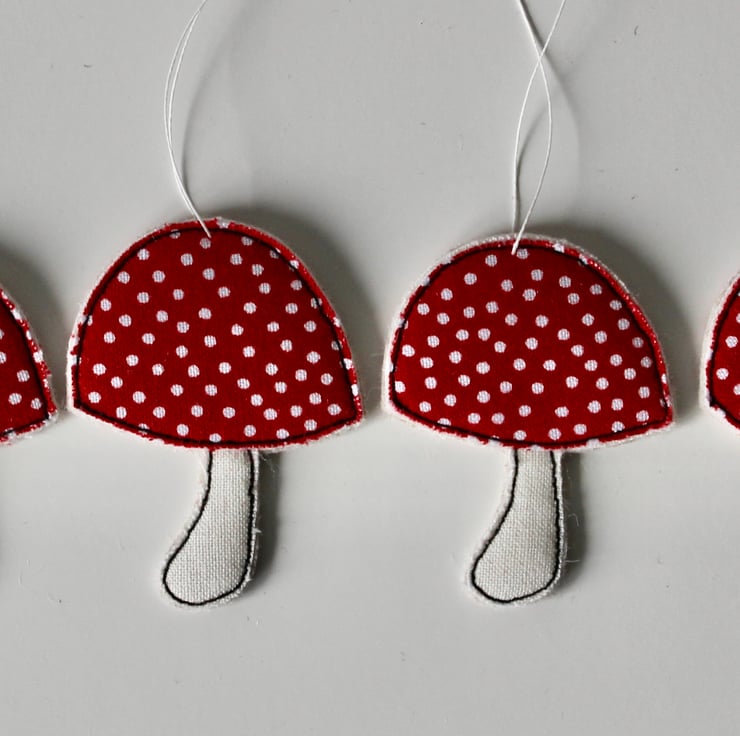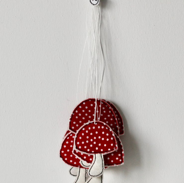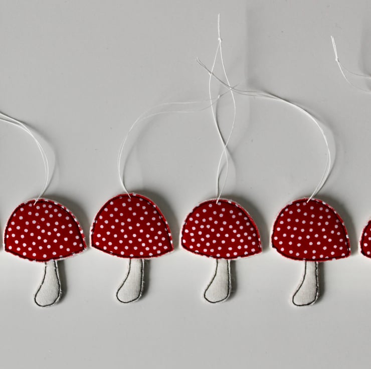 Each of the six mushrooms is sewn using a combination of 100% wool felt, cotton cloth and free hand machine embroidery; multiple layers of cloth are sewn together and cut out by hand using very sharp scissors.