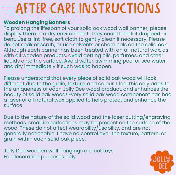 Each hanging plaque/pennant flag is lovingly designed by me. I hand draw each motivational message before it's laser cut and engraved onto 6mm thick solid oak wood. After hand finishing each hanging sign, I apply a coat of all natural wax to the oak, to seal and bring out all the texture. Each piece of oak is unique and will look different. I think this adds to the beauty of each wood hanging decoration, making them more individual - like you!