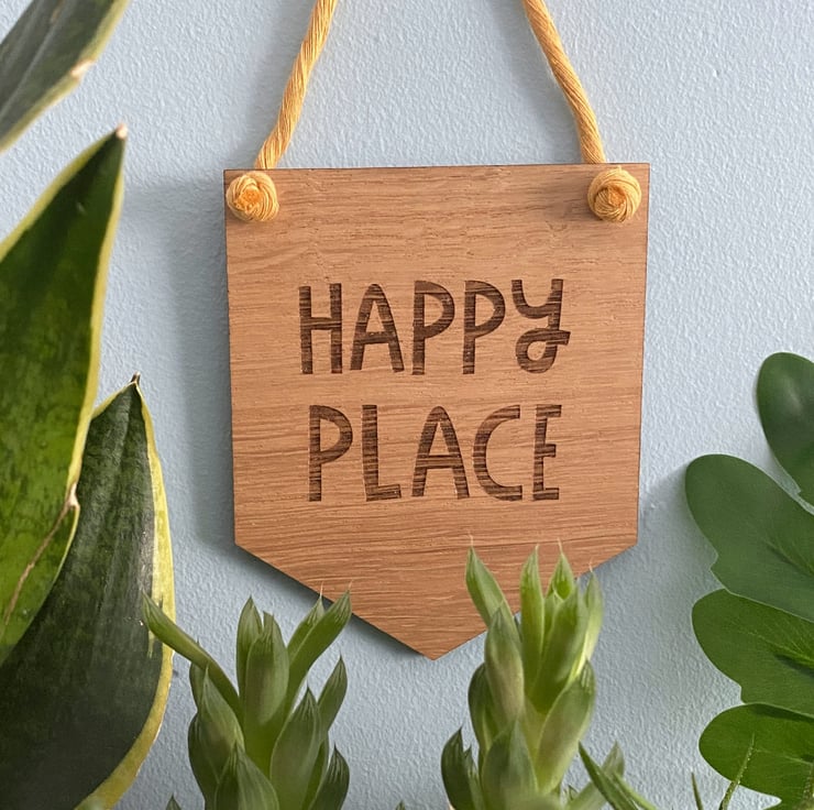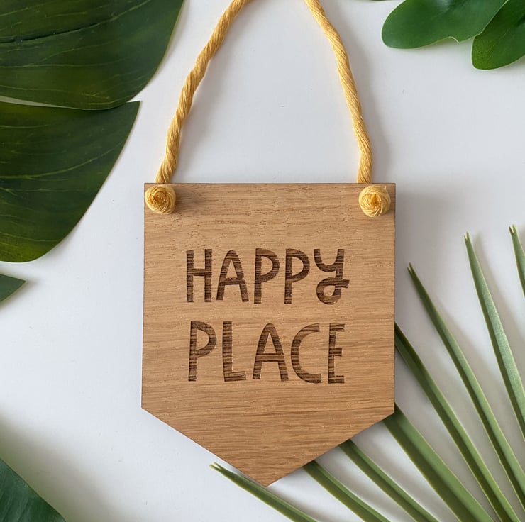 Add character to your living space with a cheerful oak hanging decoration with an engraved motivational quote for her saying: Happy Place