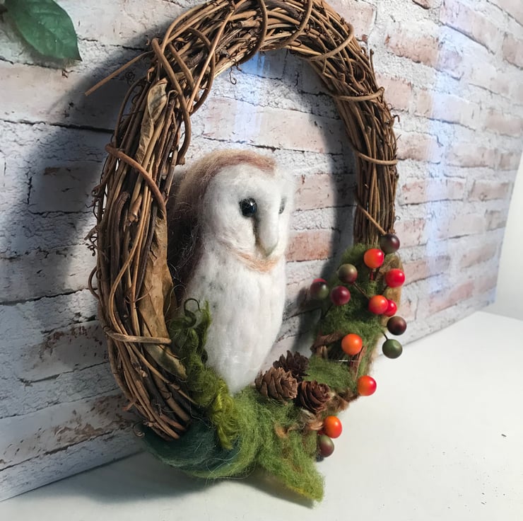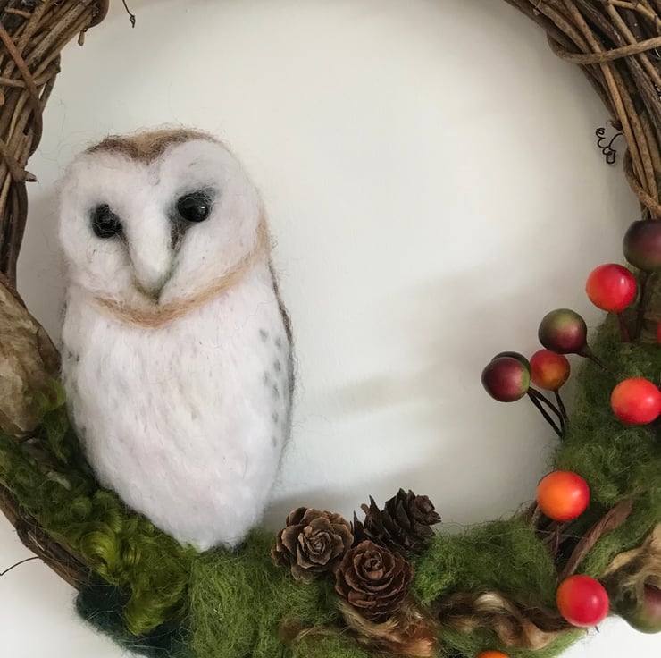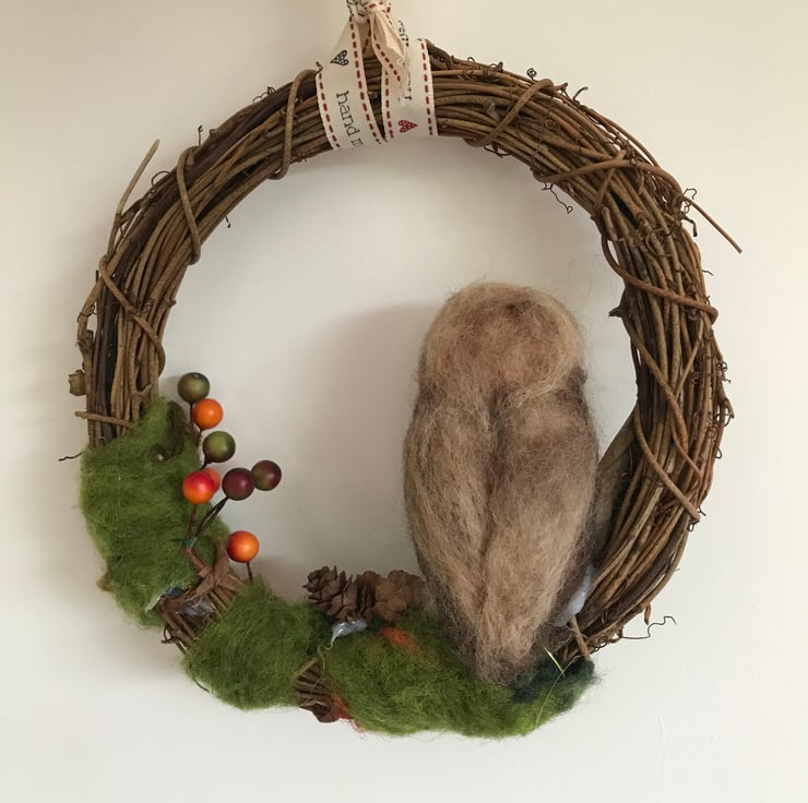 Needle felted owl wreath. Faux berries, mini fir cones and wool create the Autumn theme. Willow wreath 7.5 inches across.