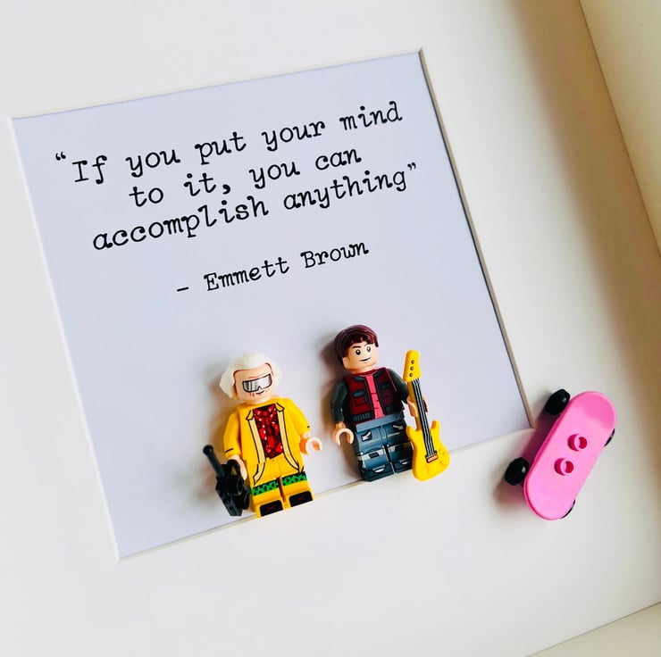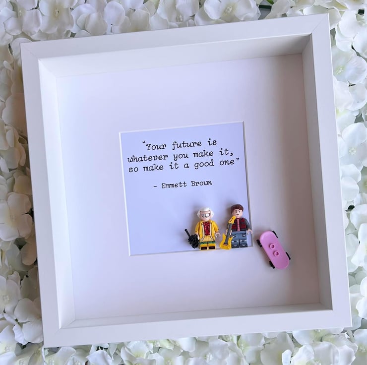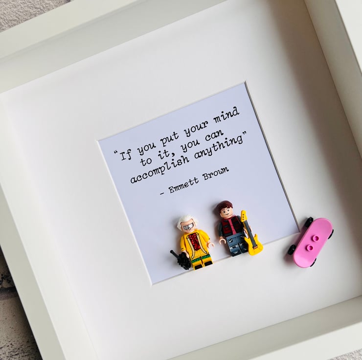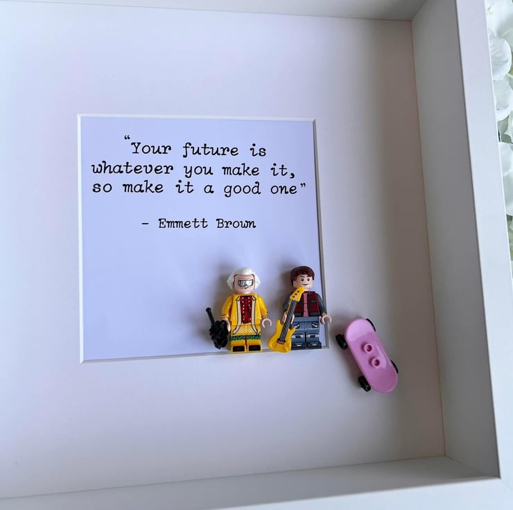 This frame is handmade and made to order and includes Doc Brown and Marty. You can choose from any of the quotes shown or if you have a favourite quote this can be printed in the frame,