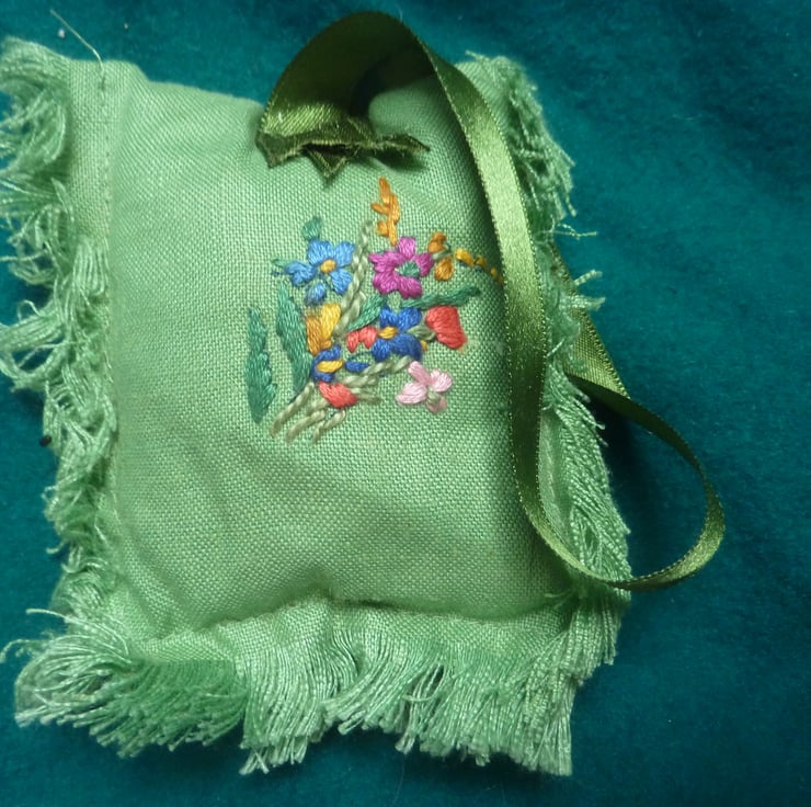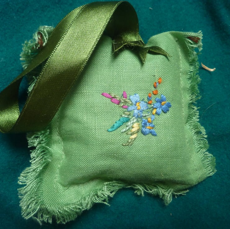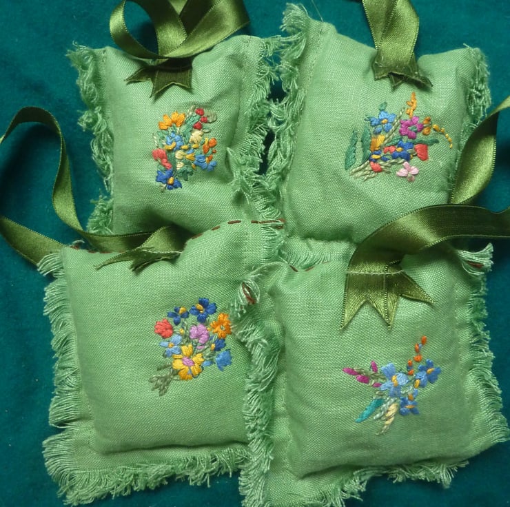 Hand worked silk embroidered square hanging lavender bags. Background is green linen and the Lavender is English lavender. Silky green ribbon completes the look.