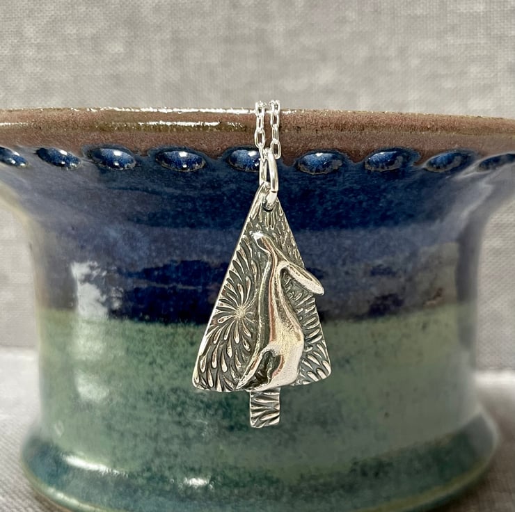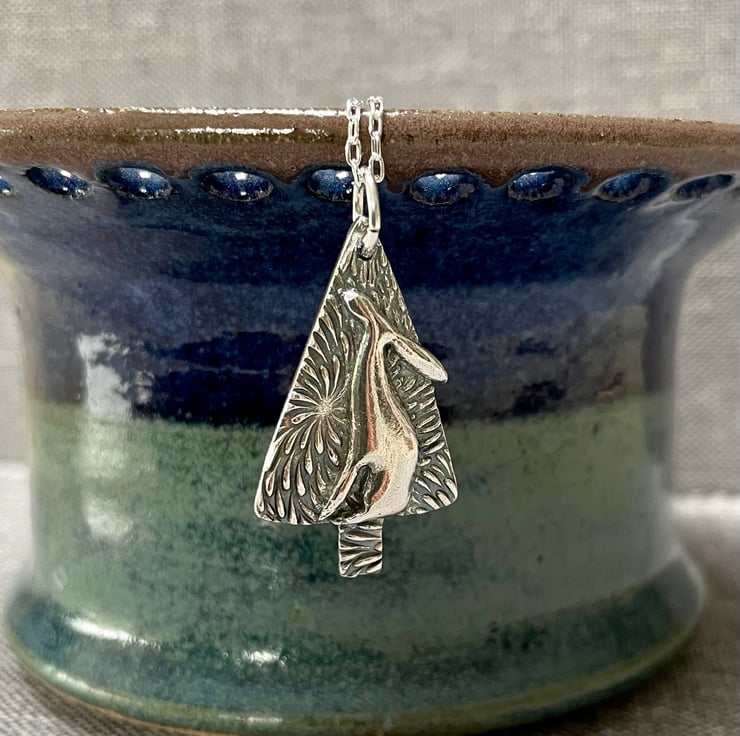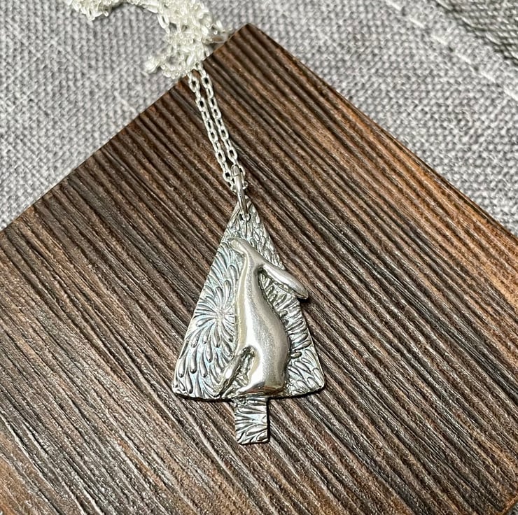A Christmas edition of my moon gazing hare, made in fine silver and hanging from an 18inch sterling silver chain.