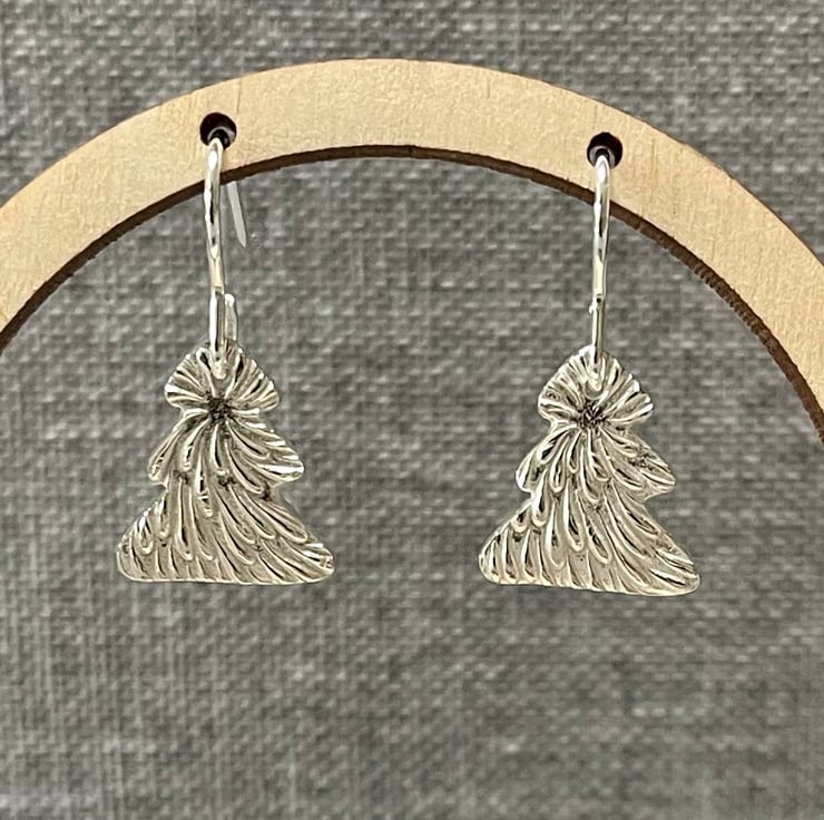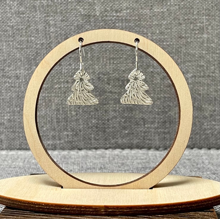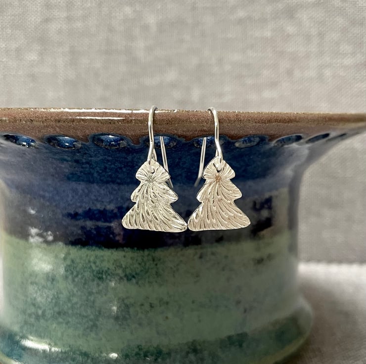 A fun and simple, yet stylish pair of drop earrings that are textured and shaped in a simple soft Christmas tree shape. Made from silver clay and hanging from sterling silver earring hooks.