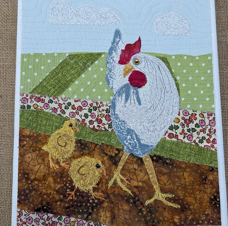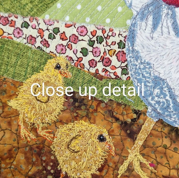 This is created by first sketching out the composition, then choosing the fabrics and threads. The fabric collage is applied to wool viscose felt before being stitched. On completion, the picture is trimmed and fixed to the deep canvas before being given a coat of ultra matt acrylic wax for protection.
