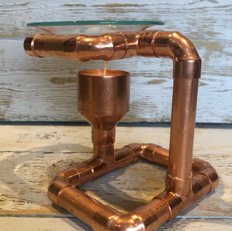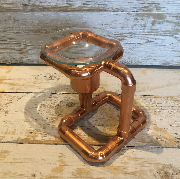 The handcrafted copper pipe oil and wax burner measures 12cm high and 12cm wide.