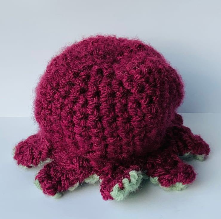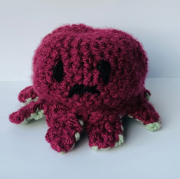This cute little octopus is really fun to play with. You can flip it inside out to reveal different sides of the octopus. One side is green and the other maroon. On each side there is a different face; one happy, one sad!