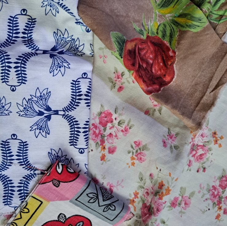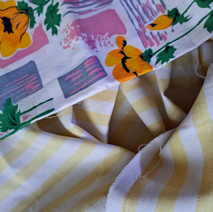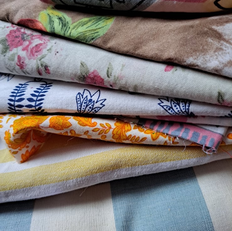 Haul is the only word to describe this big bundle of mixed vintage fabrics. There are some decent sizes here, pieces of fabric left over from long-forgotten projects. There are six pieces in all, with the biggest measuring 79cm x 52cm and all, as far as I can tell, made of cotton.