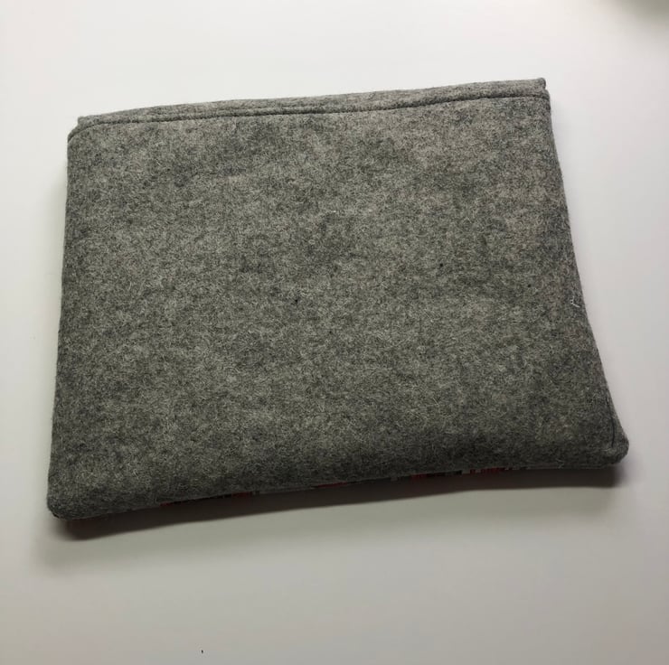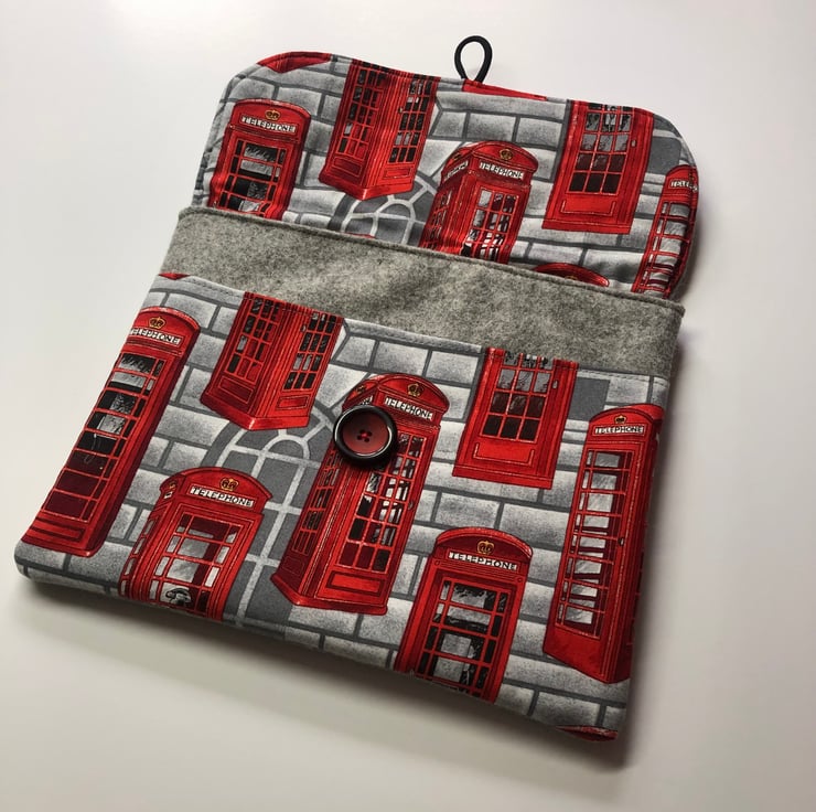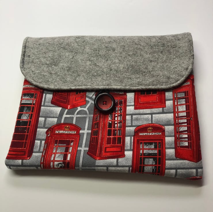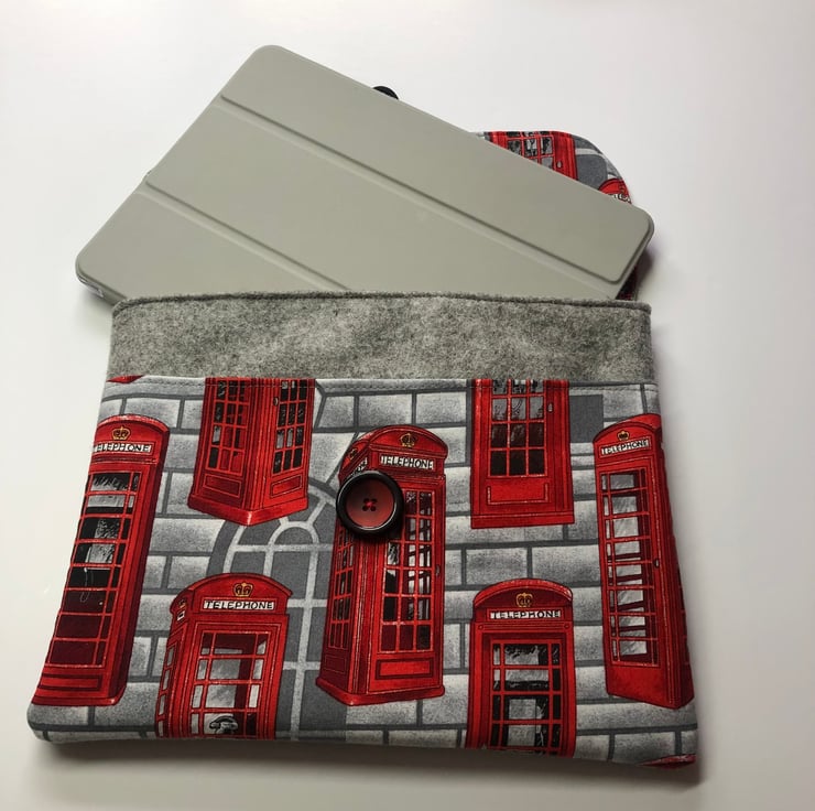 This striking iPad case will fit an iPad Air dimensions 18 x 25cm and is adapted from a pattern from Lisa Lam. Made from a grey wool felt and a cotton fabric with a brick design with red telephone boxes , it has a plain brown cotton lining in the main pocket and the front pocket is self lined. With interfacing and fleece interfacing this bag will keep your iPad snug and safe.